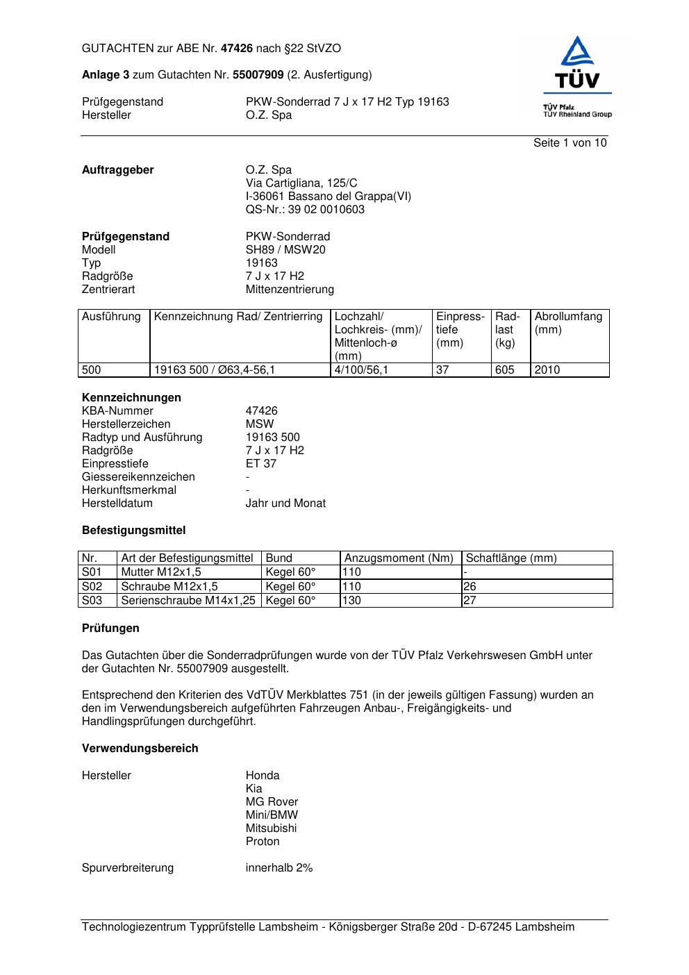 Dieses Gutachten (abe) bezieht sich auf die Alufelge co-rod 19163 in der Ausführung 7Jx17 ET 0, Mittenloch 0 mm (KBA 47426). Im PDF findest du typischerweise zulässige Reifengrößen, Auflagen/Anbauhinweise und – je nach Dokument – Hinweise zur Eintragung.
