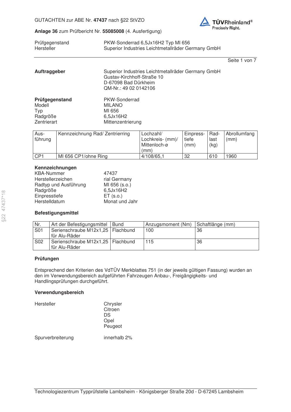 Dieses Gutachten (abe) bezieht sich auf die Alufelge brand-rial MI 656 in der Ausführung 6.5Jx16 ET 0, Mittenloch 0 mm (KBA 47437). Im PDF findest du typischerweise zulässige Reifengrößen, Auflagen/Anbauhinweise und – je nach Dokument – Hinweise zur Eintragung.