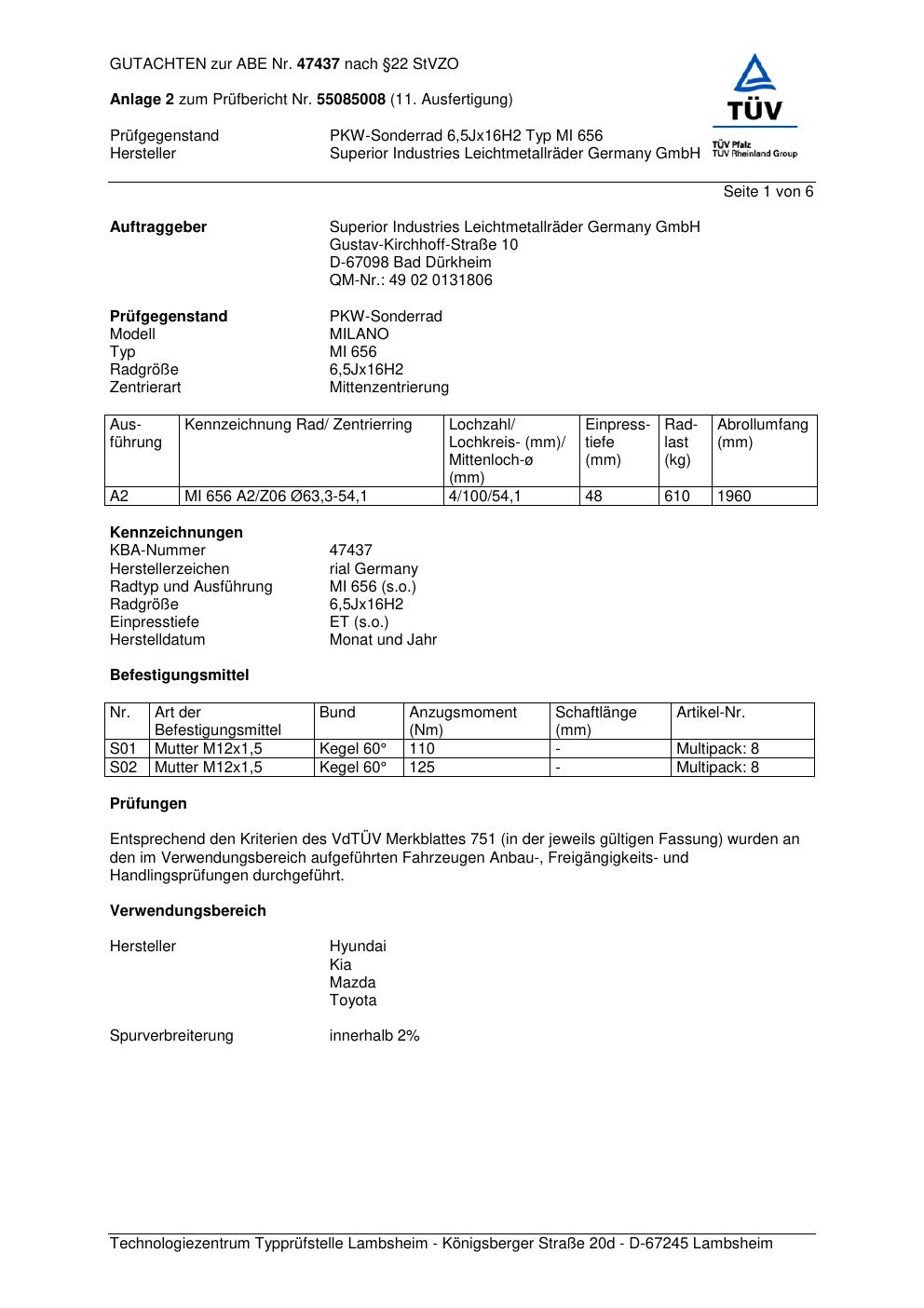 Dieses Gutachten (abe) bezieht sich auf die Alufelge brand-rial MI 656 in der Ausführung 6.5Jx16 ET 0, Mittenloch 0 mm (KBA 47437). Im PDF findest du typischerweise zulässige Reifengrößen, Auflagen/Anbauhinweise und – je nach Dokument – Hinweise zur Eintragung.