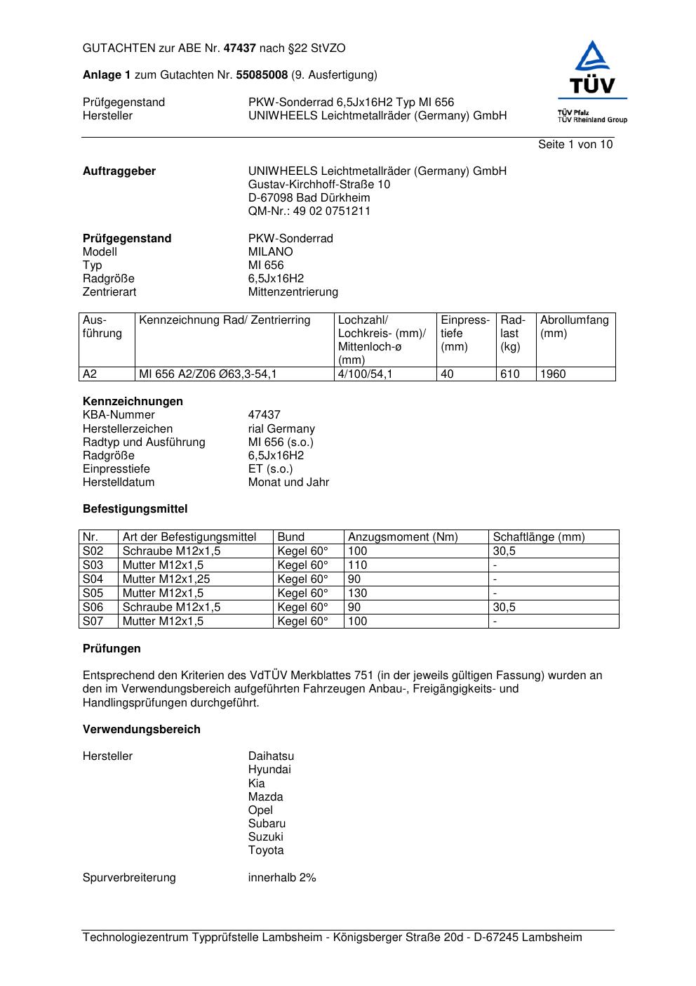 Dieses Gutachten (abe) bezieht sich auf die Alufelge brand-rial MI 656 in der Ausführung 6.5Jx16 ET 0, Mittenloch 0 mm (KBA 47437). Im PDF findest du typischerweise zulässige Reifengrößen, Auflagen/Anbauhinweise und – je nach Dokument – Hinweise zur Eintragung.