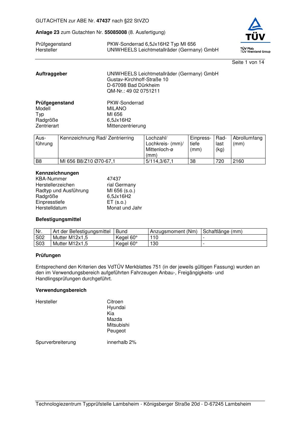 Dieses Gutachten (abe) bezieht sich auf die Alufelge brand-rial MI 656 in der Ausführung 6.5Jx16 ET 0, Mittenloch 0 mm (KBA 47437). Im PDF findest du typischerweise zulässige Reifengrößen, Auflagen/Anbauhinweise und – je nach Dokument – Hinweise zur Eintragung.