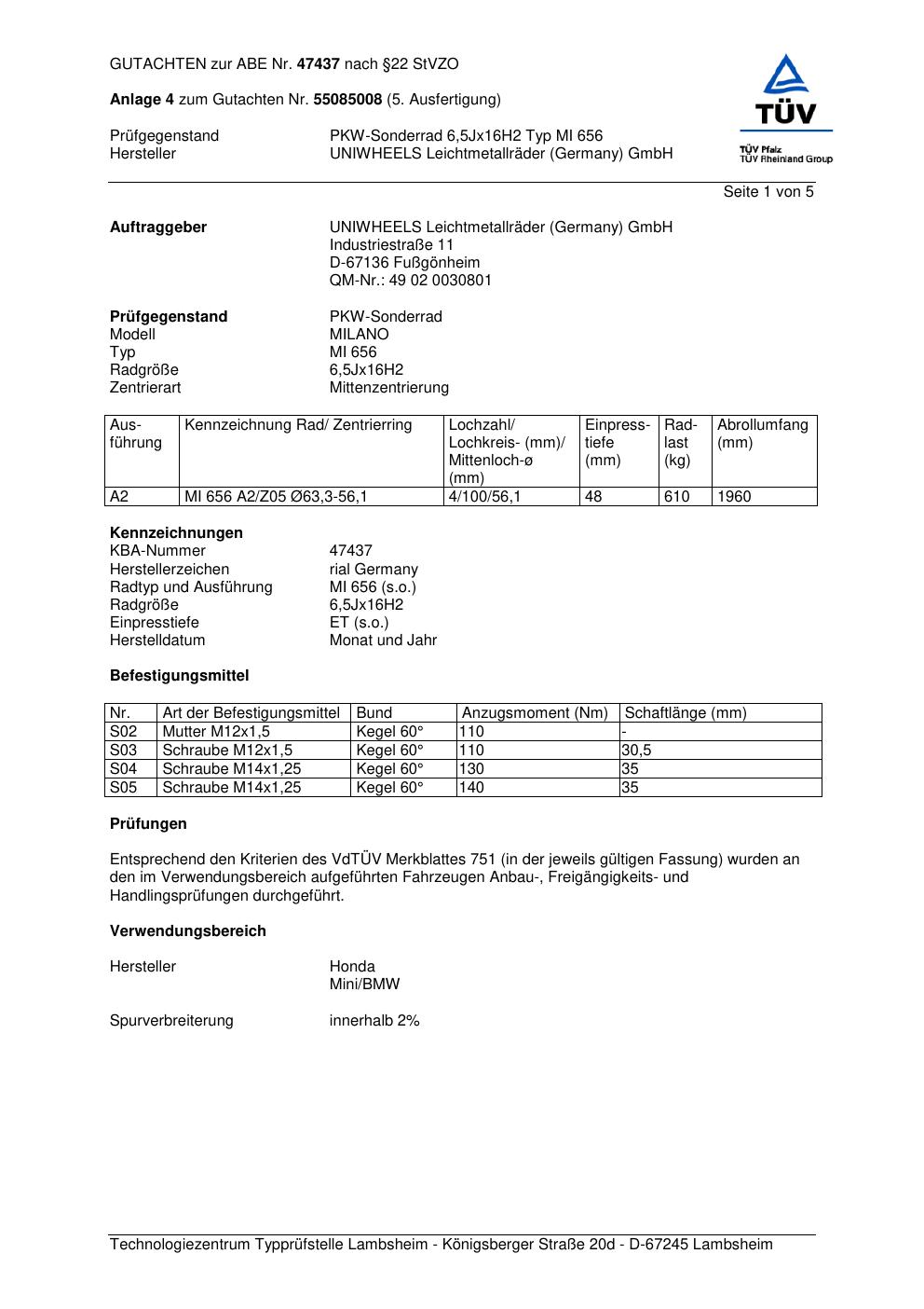 Dieses Gutachten (abe) bezieht sich auf die Alufelge brand-rial MI 656 in der Ausführung 6.5Jx16 ET 0, Mittenloch 0 mm (KBA 47437). Im PDF findest du typischerweise zulässige Reifengrößen, Auflagen/Anbauhinweise und – je nach Dokument – Hinweise zur Eintragung.