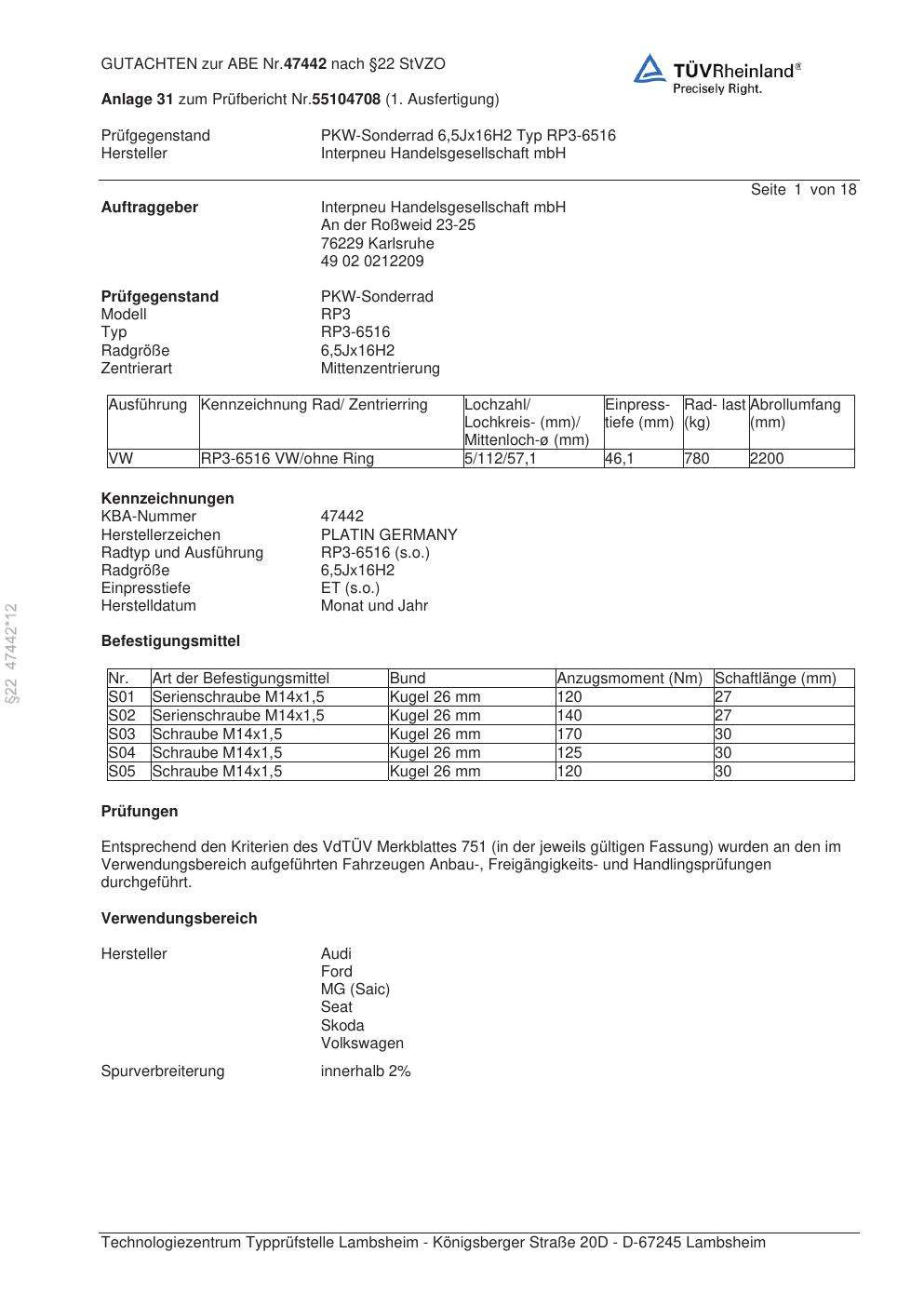 Dieses Gutachten (abe) bezieht sich auf die Alufelge Platin RP3-6516 in der Ausführung 6.5Jx16 ET 0, Mittenloch 0 mm (KBA 47442). Im PDF findest du typischerweise zulässige Reifengrößen, Auflagen/Anbauhinweise und – je nach Dokument – Hinweise zur Eintragung.