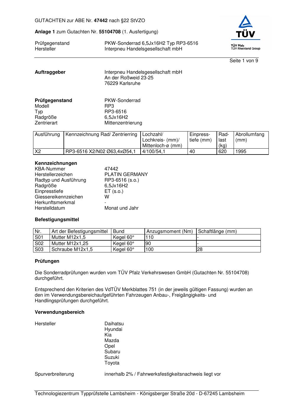Dieses Gutachten (abe) bezieht sich auf die Alufelge Platin RP3-6516 in der Ausführung 6.5Jx16 ET 0, Mittenloch 0 mm (KBA 47442). Im PDF findest du typischerweise zulässige Reifengrößen, Auflagen/Anbauhinweise und – je nach Dokument – Hinweise zur Eintragung.