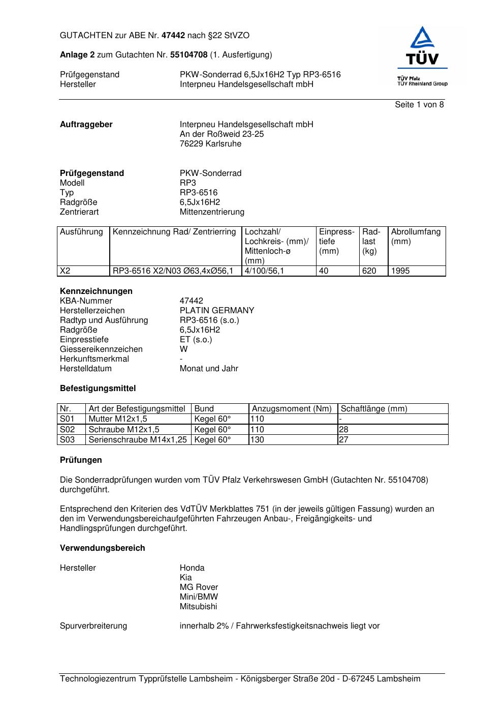 Dieses Gutachten (abe) bezieht sich auf die Alufelge Platin RP3-6516 in der Ausführung 6.5Jx16 ET 0, Mittenloch 0 mm (KBA 47442). Im PDF findest du typischerweise zulässige Reifengrößen, Auflagen/Anbauhinweise und – je nach Dokument – Hinweise zur Eintragung.