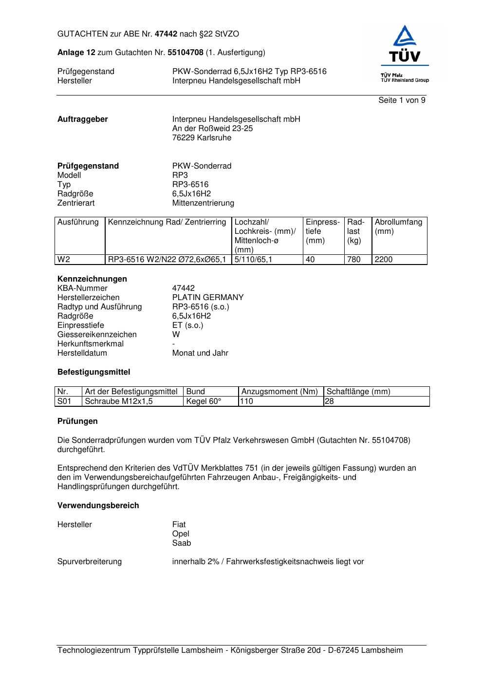 Dieses Gutachten (abe) bezieht sich auf die Alufelge Platin RP3-6516 in der Ausführung 6.5Jx16 ET 0, Mittenloch 0 mm (KBA 47442). Im PDF findest du typischerweise zulässige Reifengrößen, Auflagen/Anbauhinweise und – je nach Dokument – Hinweise zur Eintragung.
