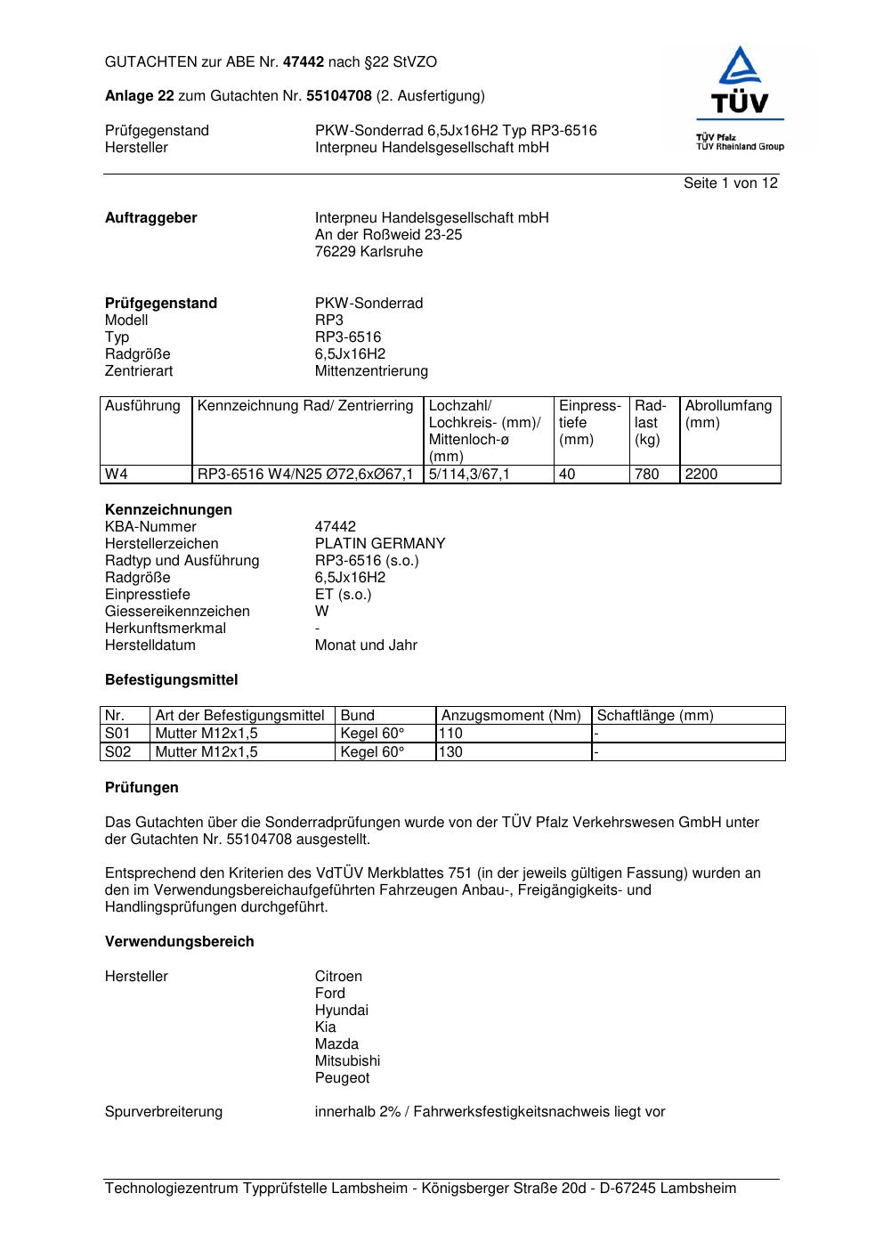 Dieses Gutachten (abe) bezieht sich auf die Alufelge Platin RP3-6516 in der Ausführung 6.5Jx16 ET 0, Mittenloch 0 mm (KBA 47442). Im PDF findest du typischerweise zulässige Reifengrößen, Auflagen/Anbauhinweise und – je nach Dokument – Hinweise zur Eintragung.