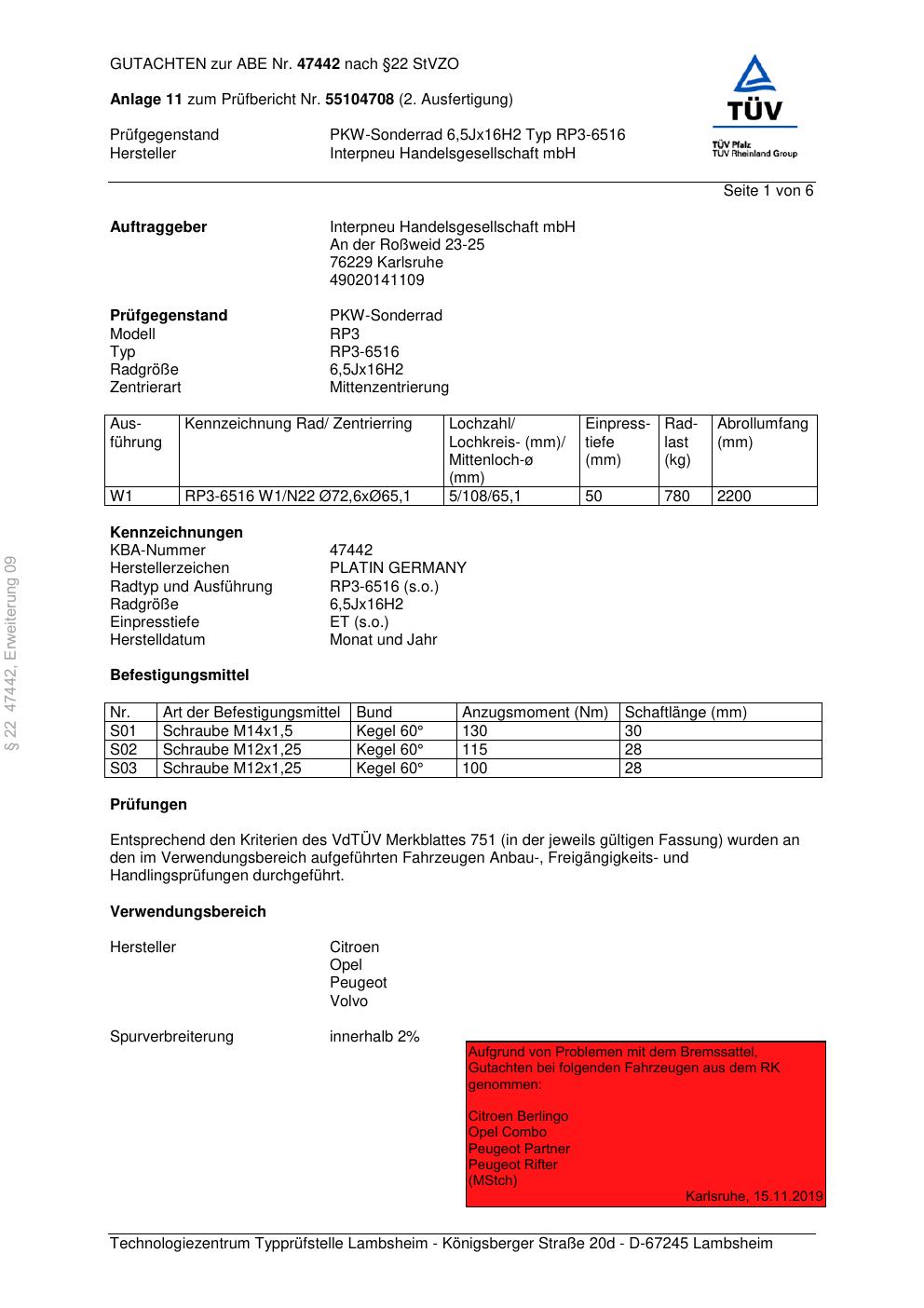 Dieses Gutachten (abe) bezieht sich auf die Alufelge Platin RP3-6516 in der Ausführung 6.5Jx16 ET 0, Mittenloch 0 mm (KBA 47442). Im PDF findest du typischerweise zulässige Reifengrößen, Auflagen/Anbauhinweise und – je nach Dokument – Hinweise zur Eintragung.