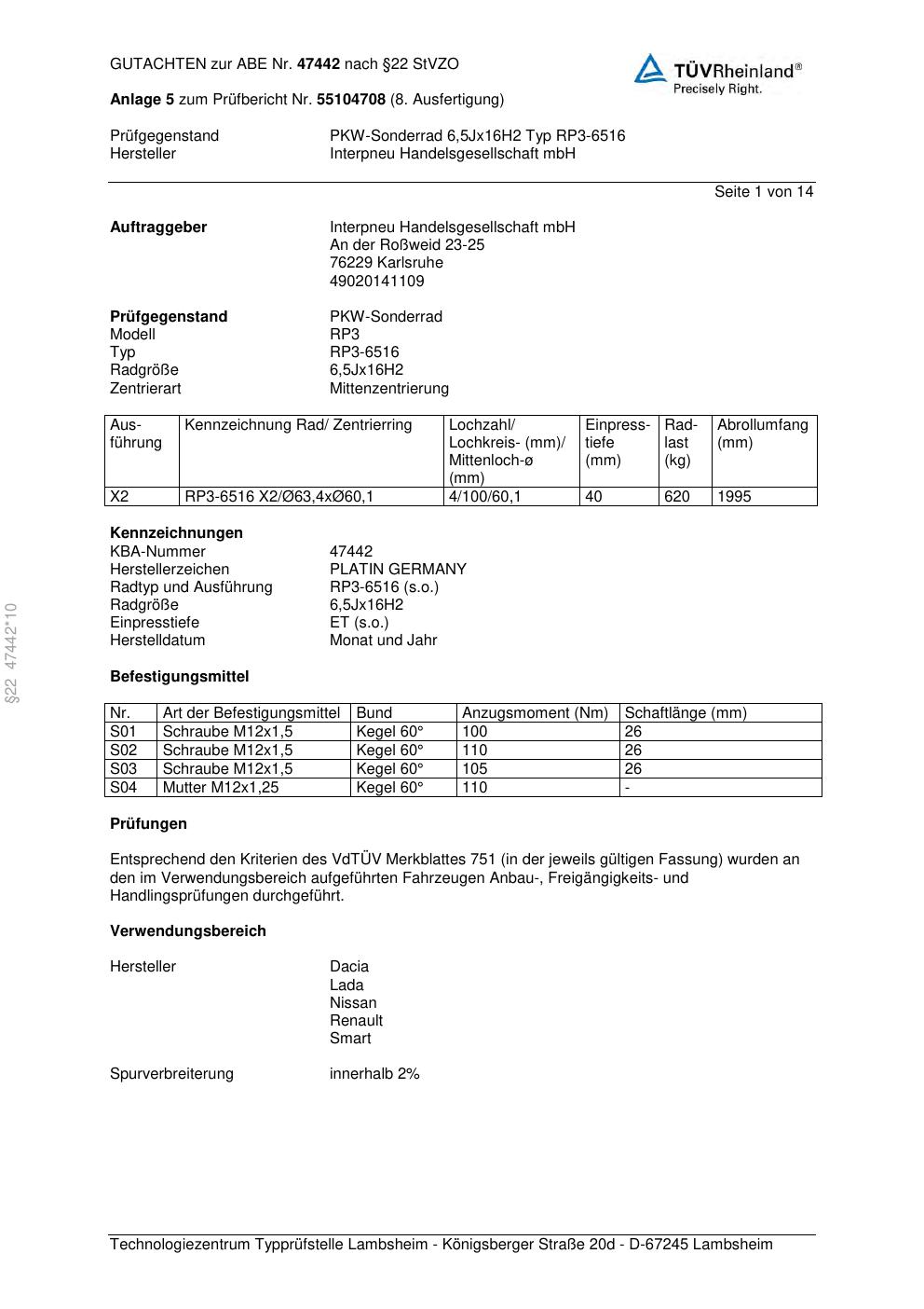Felgengutachten / abe für Alufelgen Platin RP3-6516 (6.5Jx16 ET 0, Mittenloch 0 mm) mit KBA 47442 (Zertifikatsnummer 47442). Hier kostenlos als PDF herunterladen. Der Download-Link ist 24 Stunden gültig und kann bis zu zwei Mal verwendet werden.