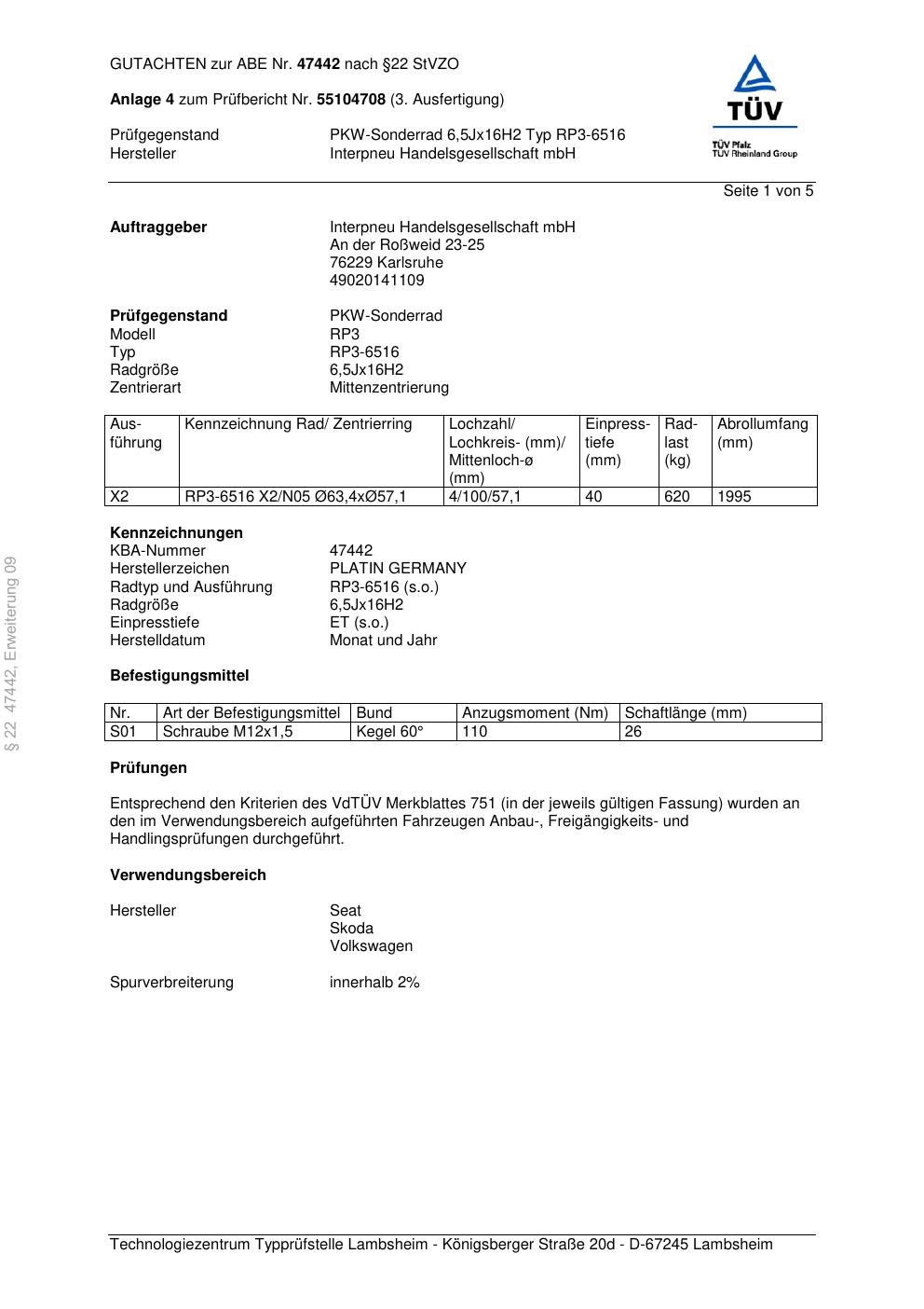 Dieses Gutachten (abe) bezieht sich auf die Alufelge Platin RP3-6516 in der Ausführung 6.5Jx16 ET 0, Mittenloch 0 mm (KBA 47442). Im PDF findest du typischerweise zulässige Reifengrößen, Auflagen/Anbauhinweise und – je nach Dokument – Hinweise zur Eintragung.