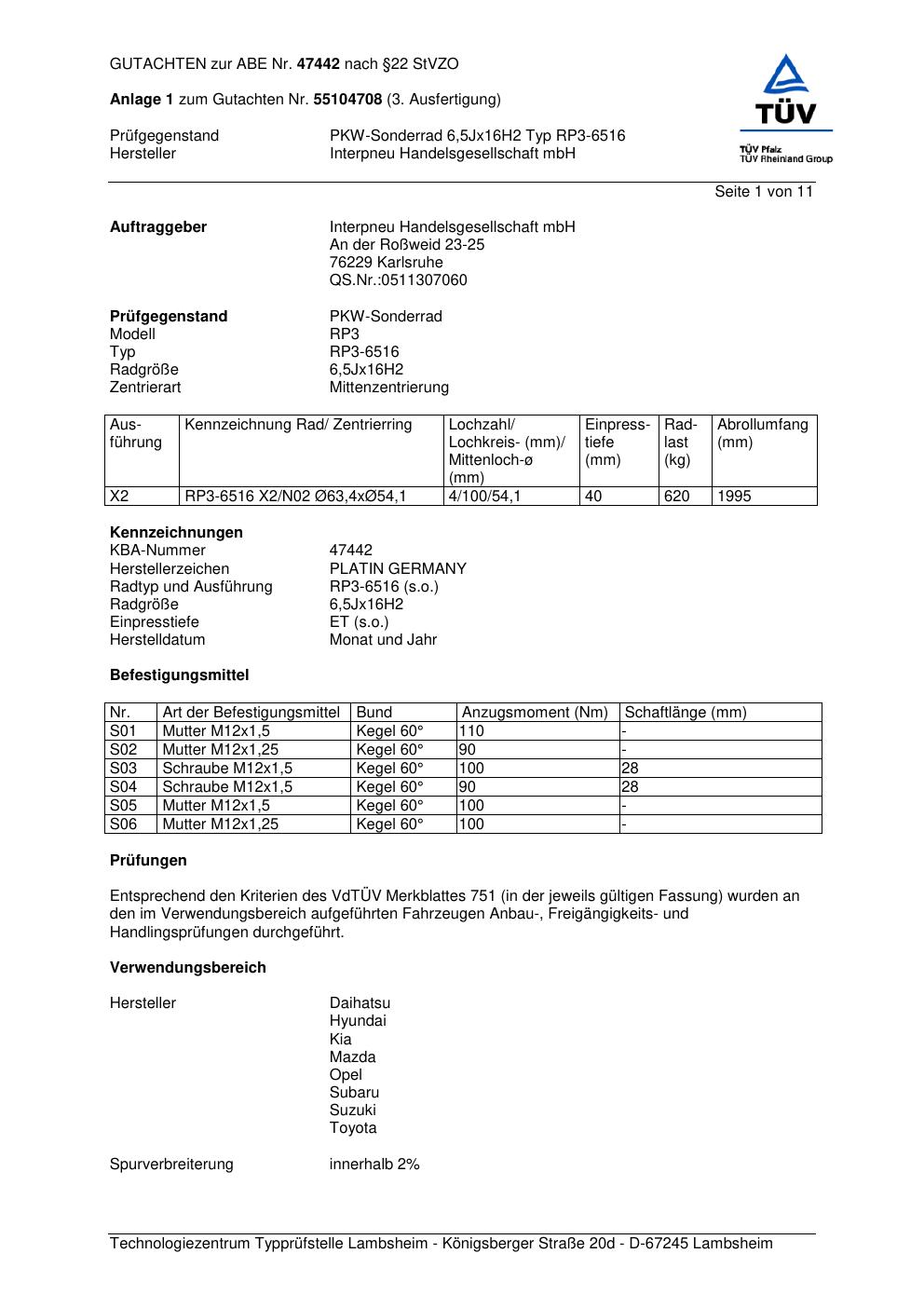 Dieses Gutachten (abe) bezieht sich auf die Alufelge Platin RP3-6516 in der Ausführung 6.5Jx16 ET 0, Mittenloch 0 mm (KBA 47442). Im PDF findest du typischerweise zulässige Reifengrößen, Auflagen/Anbauhinweise und – je nach Dokument – Hinweise zur Eintragung.