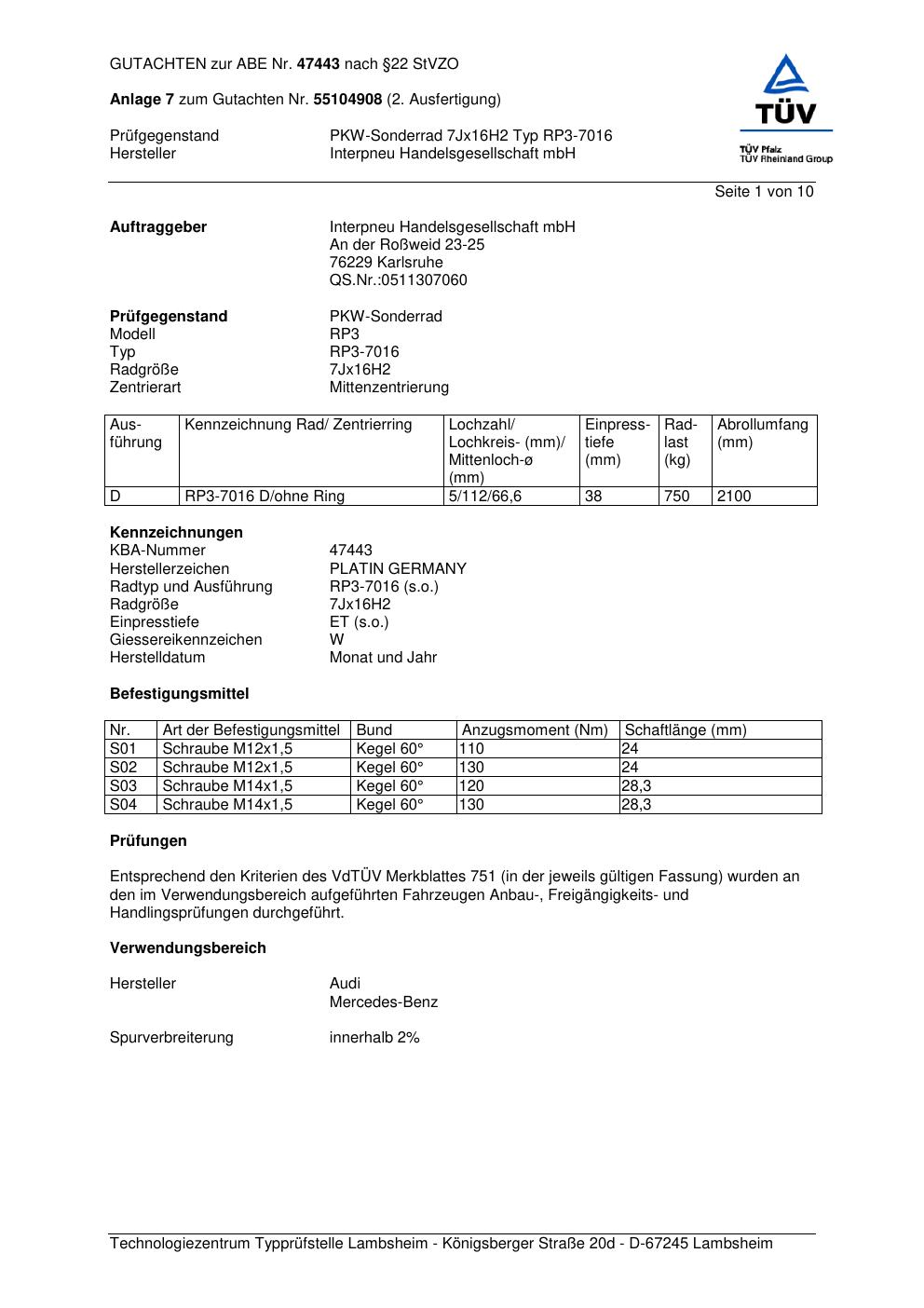 Dieses Gutachten (abe) bezieht sich auf die Alufelge Platin RP3-7016 in der Ausführung 7Jx16 ET 0, Mittenloch 0 mm (KBA 47443). Im PDF findest du typischerweise zulässige Reifengrößen, Auflagen/Anbauhinweise und – je nach Dokument – Hinweise zur Eintragung.