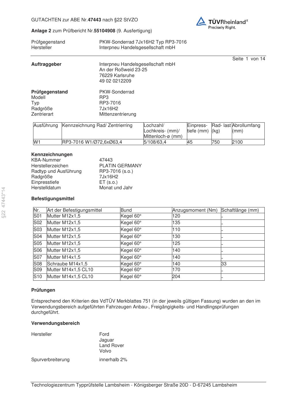 Dieses Gutachten (abe) bezieht sich auf die Alufelge Platin RP3-7016 in der Ausführung 7Jx16 ET 0, Mittenloch 0 mm (KBA 47443). Im PDF findest du typischerweise zulässige Reifengrößen, Auflagen/Anbauhinweise und – je nach Dokument – Hinweise zur Eintragung.