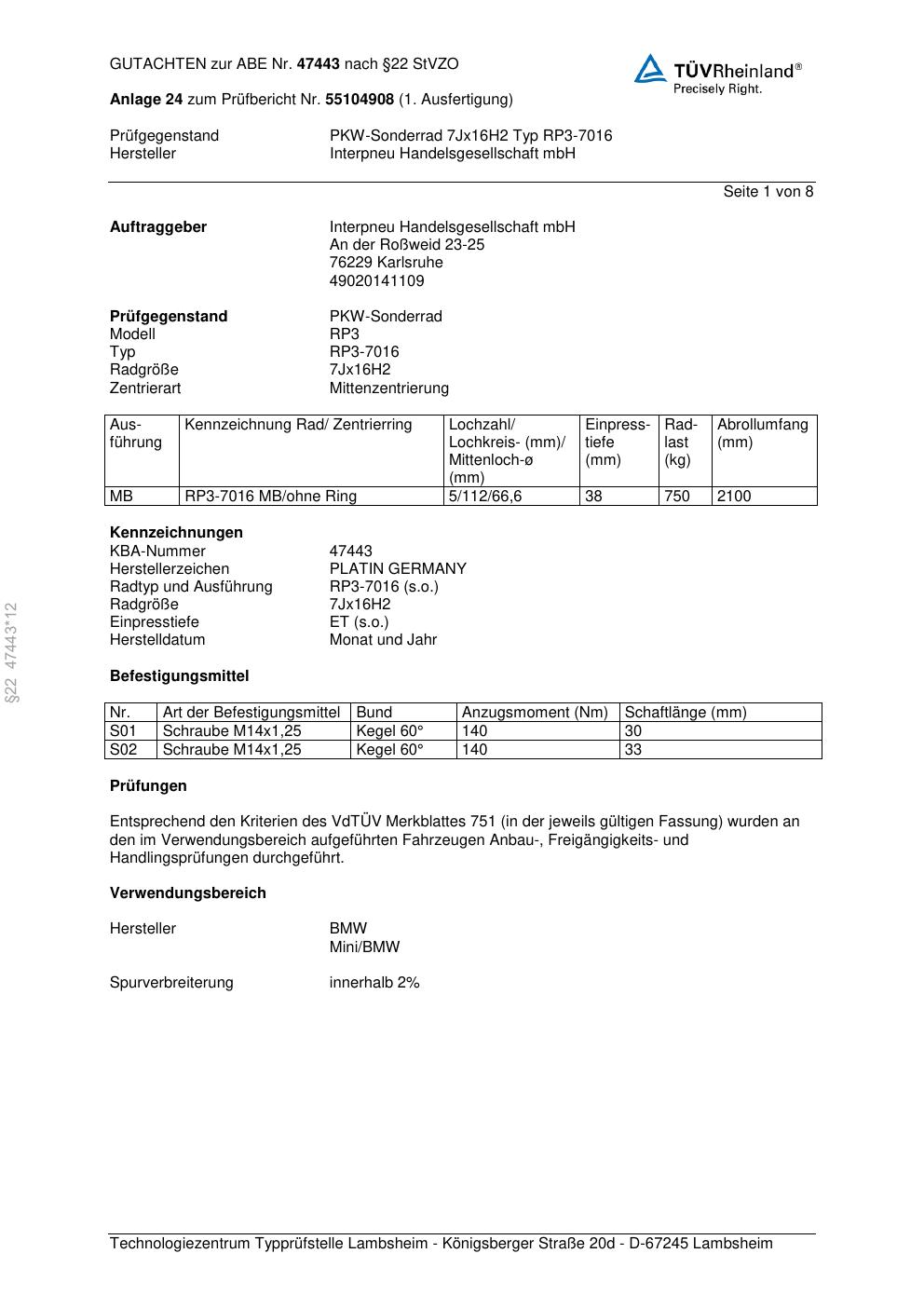 Dieses Gutachten (abe) bezieht sich auf die Alufelge Platin RP3-7016 in der Ausführung 7Jx16 ET 0, Mittenloch 0 mm (KBA 47443). Im PDF findest du typischerweise zulässige Reifengrößen, Auflagen/Anbauhinweise und – je nach Dokument – Hinweise zur Eintragung.