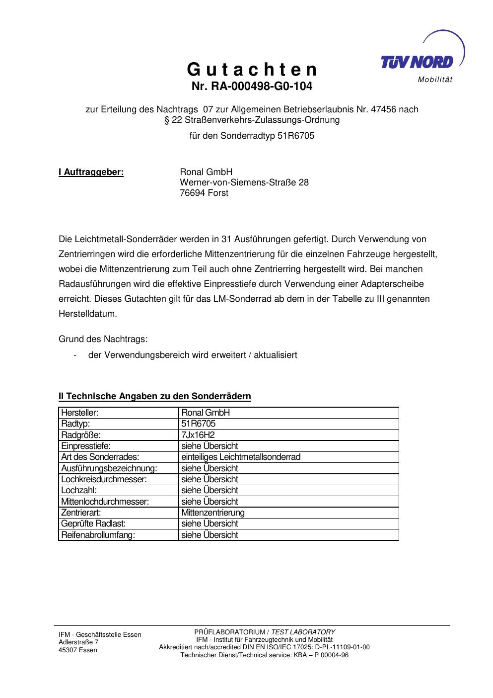 Dieses Gutachten (abe) bezieht sich auf die Alufelge Ronal 51R6705 in der Ausführung 7Jx16 ET 0, Mittenloch 0 mm (KBA 47456). Im PDF findest du typischerweise zulässige Reifengrößen, Auflagen/Anbauhinweise und – je nach Dokument – Hinweise zur Eintragung.