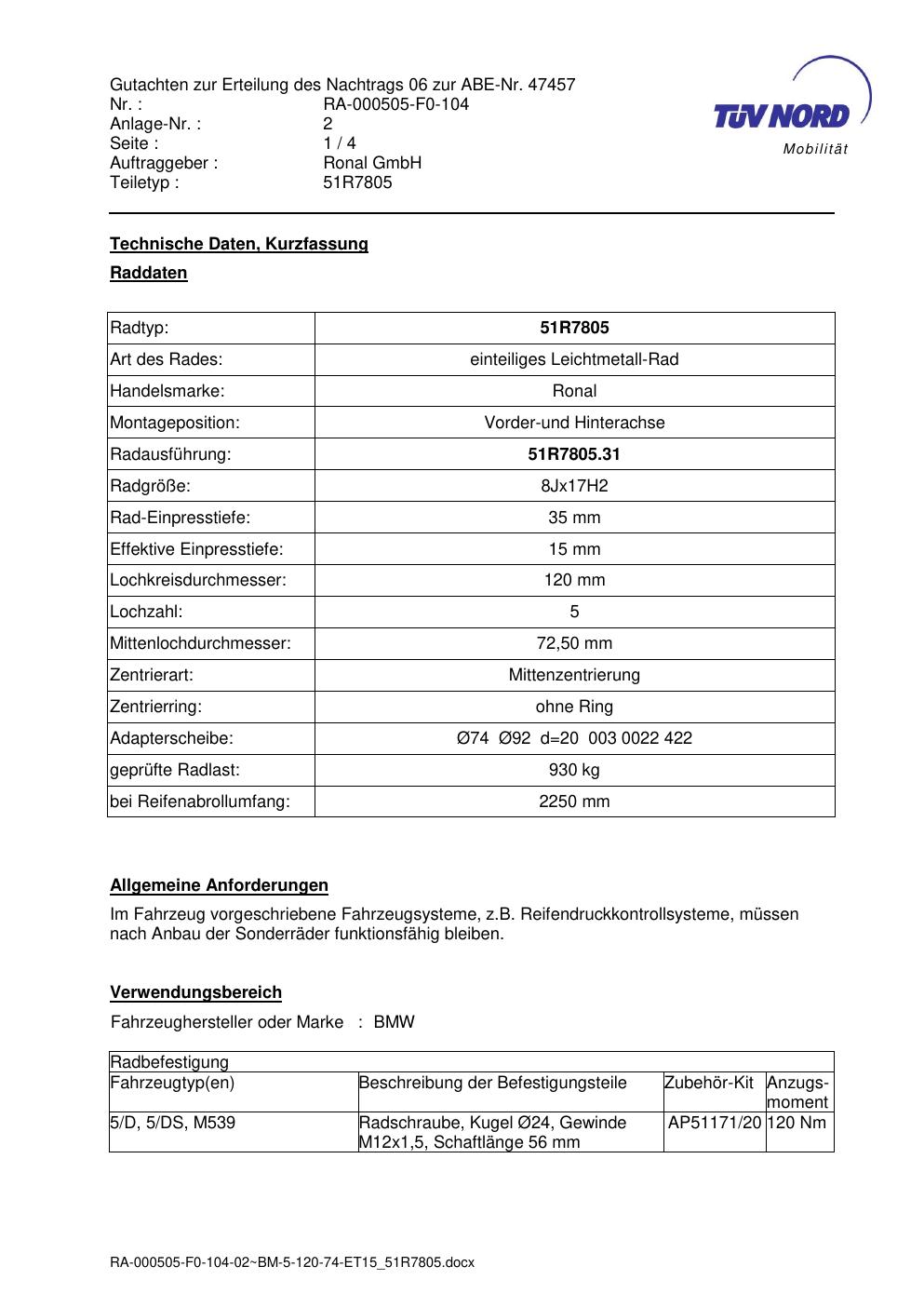 Dieses Gutachten (abe) bezieht sich auf die Alufelge Ronal 51R7805 in der Ausführung 8Jx17 ET 0, Mittenloch 0 mm (KBA 47457). Im PDF findest du typischerweise zulässige Reifengrößen, Auflagen/Anbauhinweise und – je nach Dokument – Hinweise zur Eintragung.