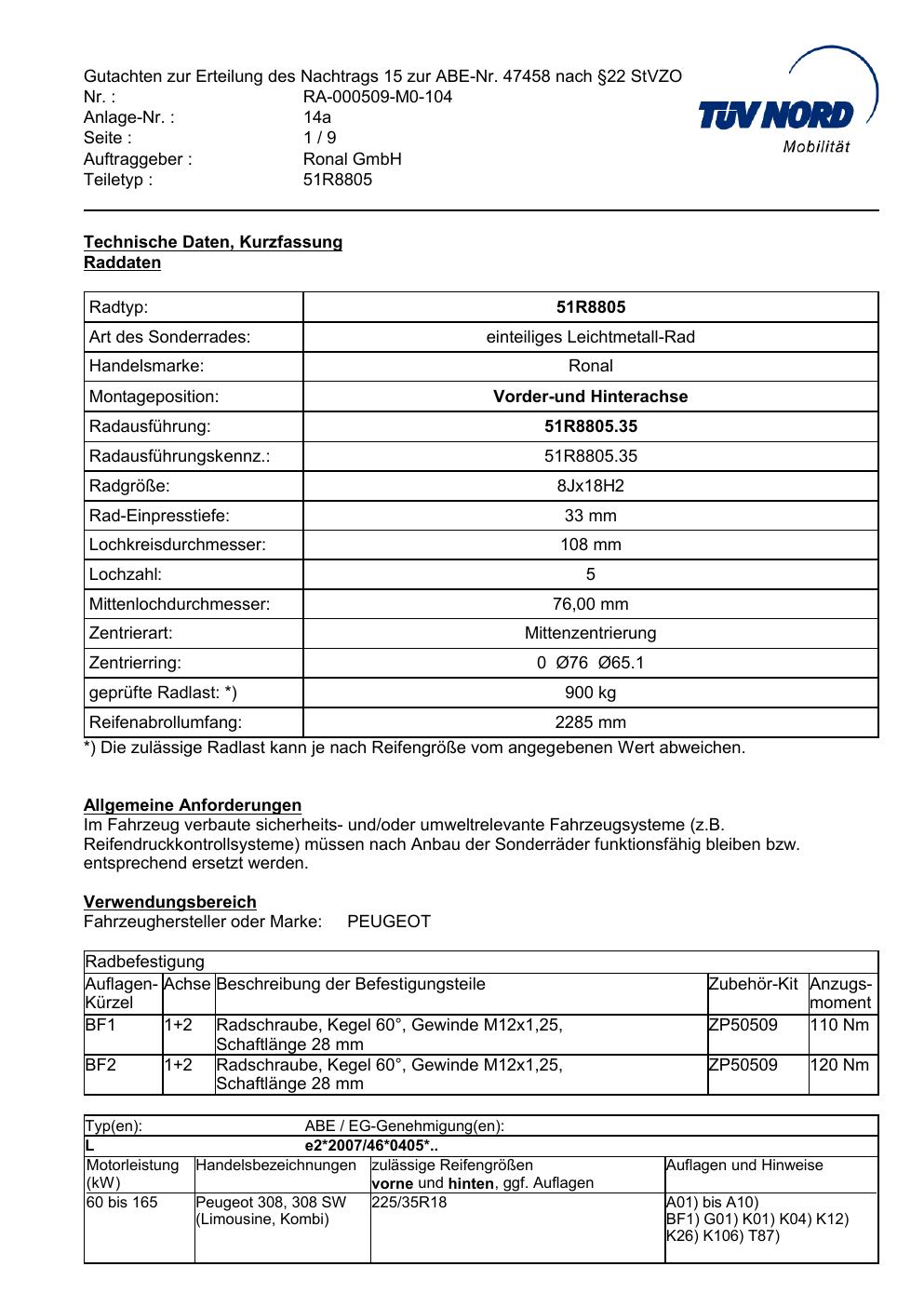 Dieses Gutachten (abe) bezieht sich auf die Alufelge Ronal 51R8805 in der Ausführung 8Jx18 ET 0, Mittenloch 0 mm (KBA 47458). Im PDF findest du typischerweise zulässige Reifengrößen, Auflagen/Anbauhinweise und – je nach Dokument – Hinweise zur Eintragung.