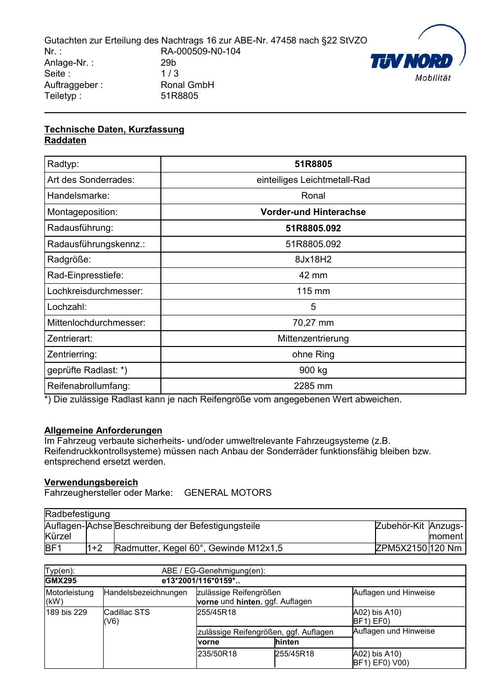 Dieses Gutachten (abe) bezieht sich auf die Alufelge Ronal 51R8805 in der Ausführung 8Jx18 ET 0, Mittenloch 0 mm (KBA 47458). Im PDF findest du typischerweise zulässige Reifengrößen, Auflagen/Anbauhinweise und – je nach Dokument – Hinweise zur Eintragung.