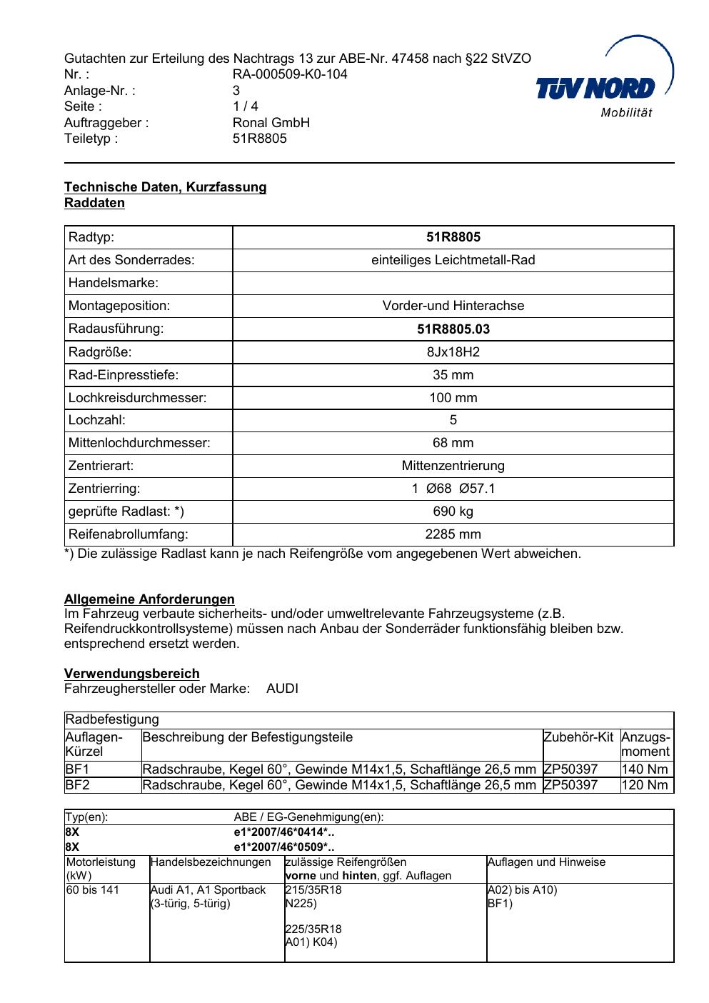 Dieses Gutachten (abe) bezieht sich auf die Alufelge Ronal 51R8805 in der Ausführung 8Jx18 ET 0, Mittenloch 0 mm (KBA 47458). Im PDF findest du typischerweise zulässige Reifengrößen, Auflagen/Anbauhinweise und – je nach Dokument – Hinweise zur Eintragung.
