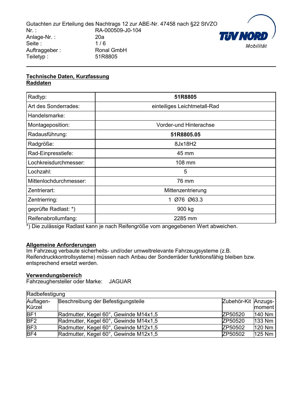 Dieses Gutachten (abe) bezieht sich auf die Alufelge Ronal 51R8805 in der Ausführung 8Jx18 ET 0, Mittenloch 0 mm (KBA 47458). Im PDF findest du typischerweise zulässige Reifengrößen, Auflagen/Anbauhinweise und – je nach Dokument – Hinweise zur Eintragung.