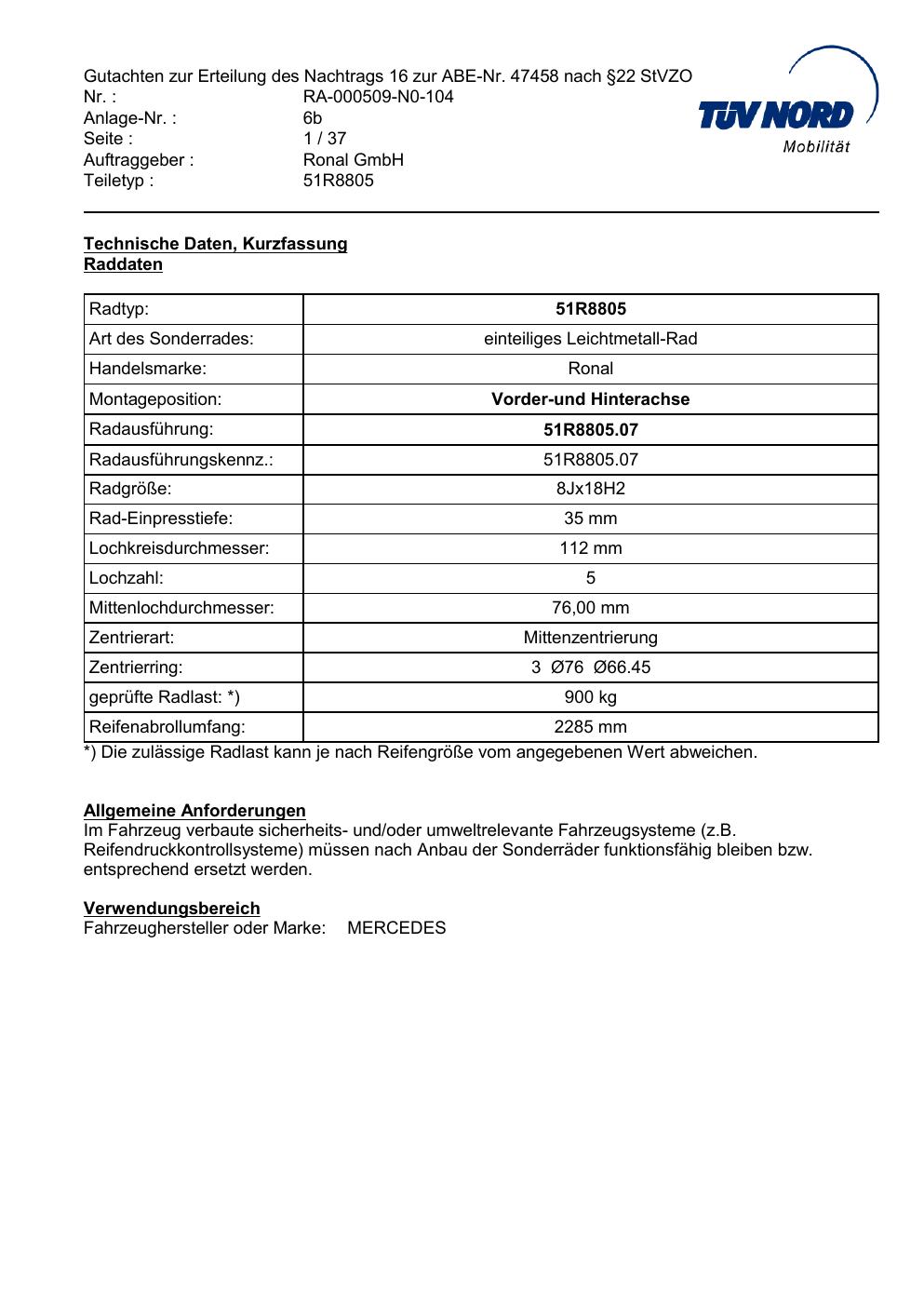 Dieses Gutachten (abe) bezieht sich auf die Alufelge Ronal 51R8805 in der Ausführung 8Jx18 ET 0, Mittenloch 0 mm (KBA 47458). Im PDF findest du typischerweise zulässige Reifengrößen, Auflagen/Anbauhinweise und – je nach Dokument – Hinweise zur Eintragung.