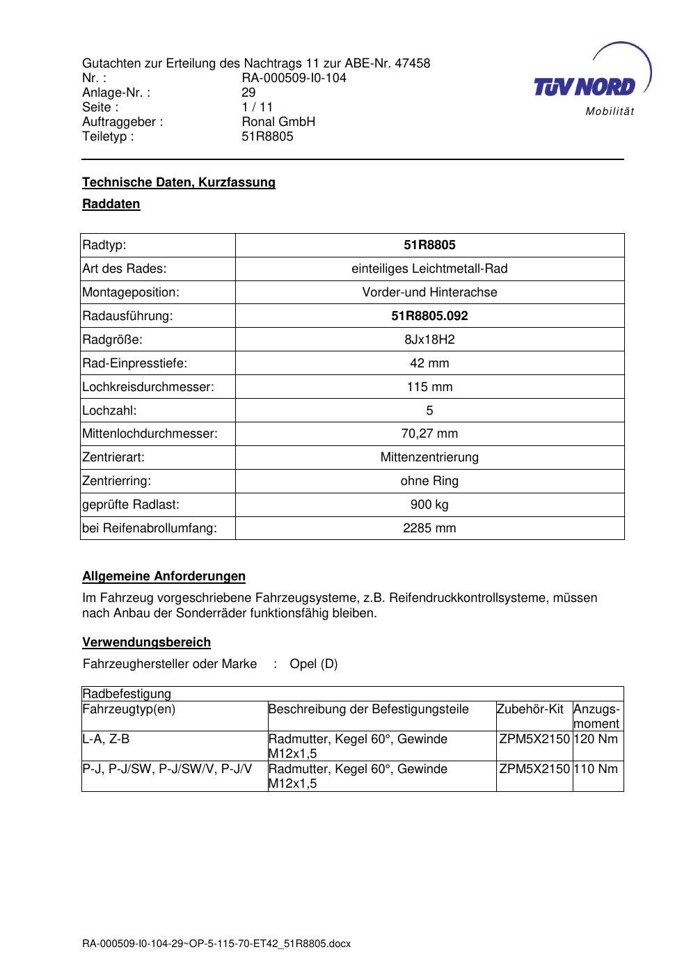Dieses Gutachten (abe) bezieht sich auf die Alufelge Ronal 51R8805 in der Ausführung 8Jx18 ET 0, Mittenloch 0 mm (KBA 47458). Im PDF findest du typischerweise zulässige Reifengrößen, Auflagen/Anbauhinweise und – je nach Dokument – Hinweise zur Eintragung.
