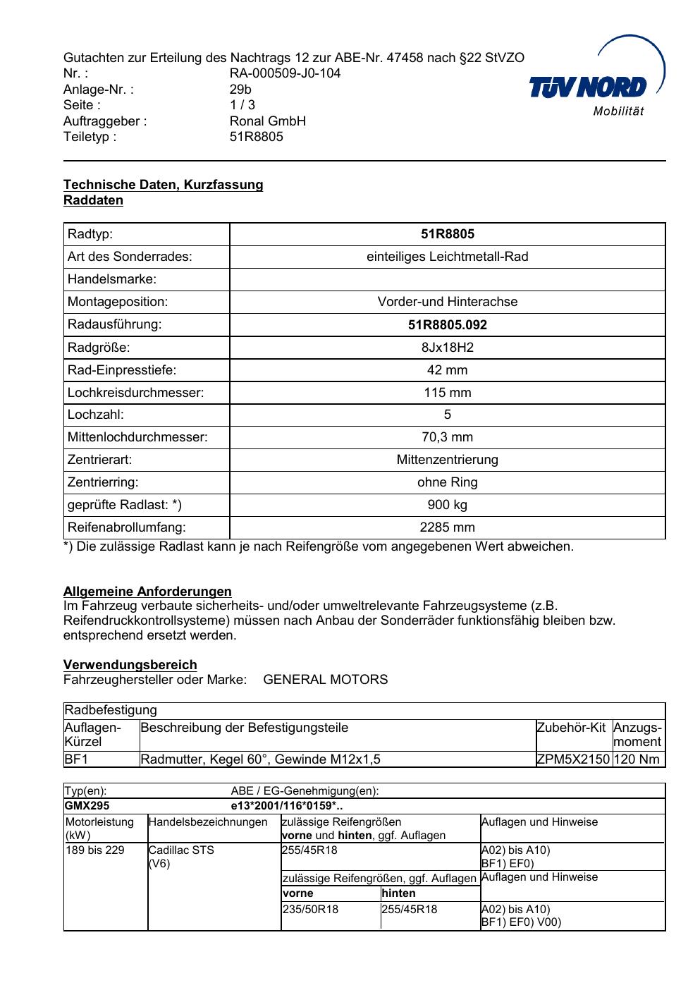 Dieses Gutachten (abe) bezieht sich auf die Alufelge Ronal 51R8805 in der Ausführung 8Jx18 ET 0, Mittenloch 0 mm (KBA 47458). Im PDF findest du typischerweise zulässige Reifengrößen, Auflagen/Anbauhinweise und – je nach Dokument – Hinweise zur Eintragung.