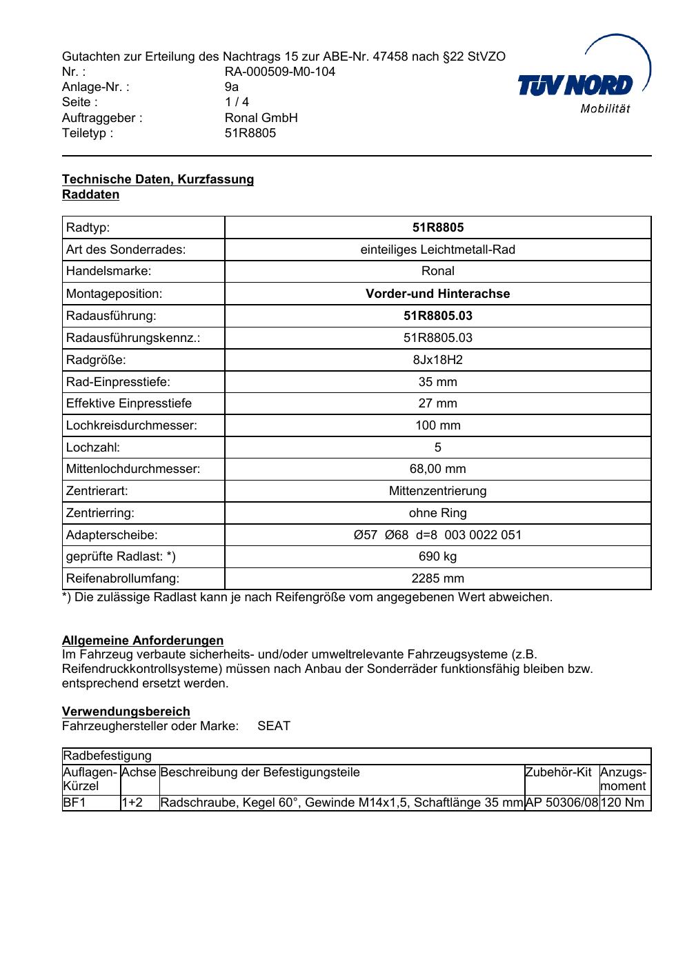 Dieses Gutachten (abe) bezieht sich auf die Alufelge Ronal 51R8805 in der Ausführung 8Jx18 ET 0, Mittenloch 0 mm (KBA 47458). Im PDF findest du typischerweise zulässige Reifengrößen, Auflagen/Anbauhinweise und – je nach Dokument – Hinweise zur Eintragung.