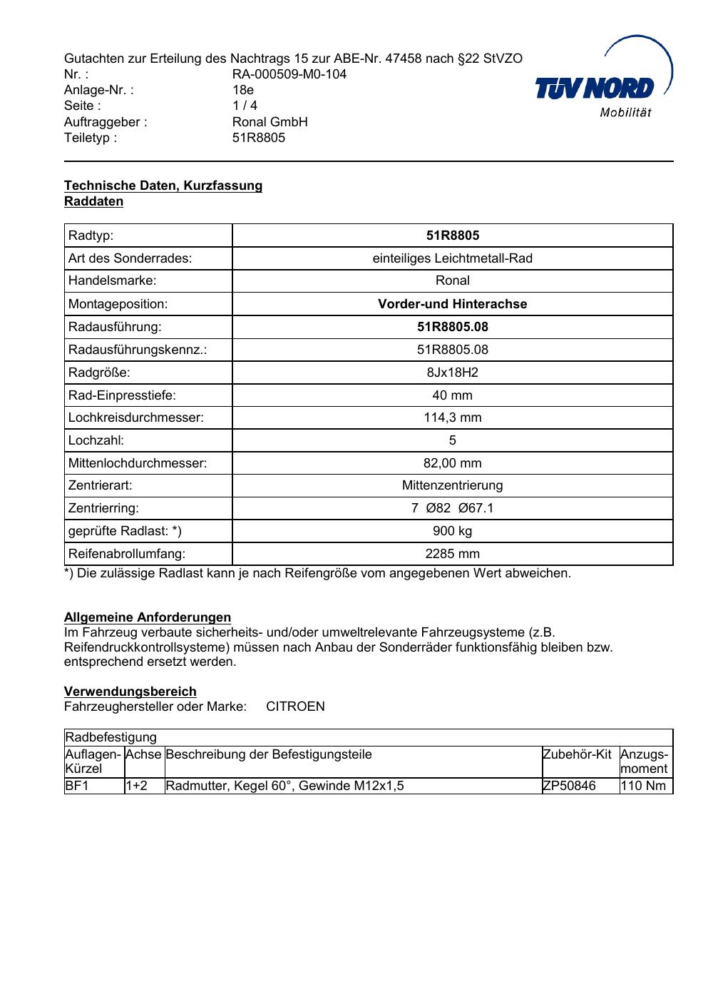 Dieses Gutachten (abe) bezieht sich auf die Alufelge Ronal 51R8805 in der Ausführung 8Jx18 ET 0, Mittenloch 0 mm (KBA 47458). Im PDF findest du typischerweise zulässige Reifengrößen, Auflagen/Anbauhinweise und – je nach Dokument – Hinweise zur Eintragung.