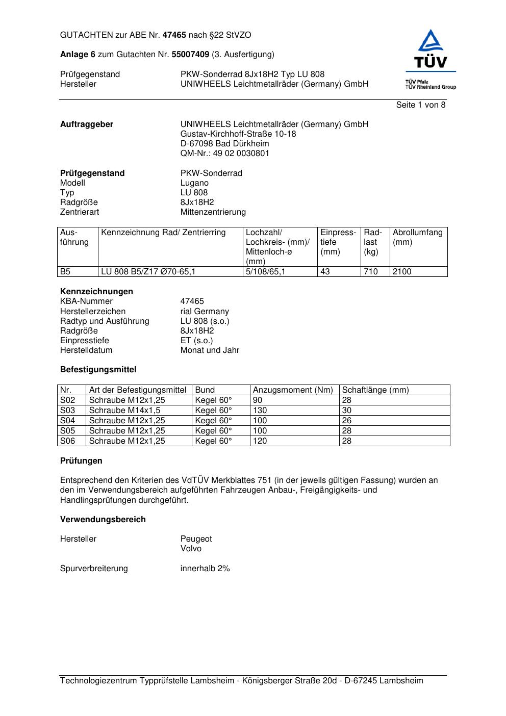 Dieses Gutachten (abe) bezieht sich auf die Alufelge brand-rial LU 808 in der Ausführung 8Jx18 ET 0, Mittenloch 0 mm (KBA 47465). Im PDF findest du typischerweise zulässige Reifengrößen, Auflagen/Anbauhinweise und – je nach Dokument – Hinweise zur Eintragung.