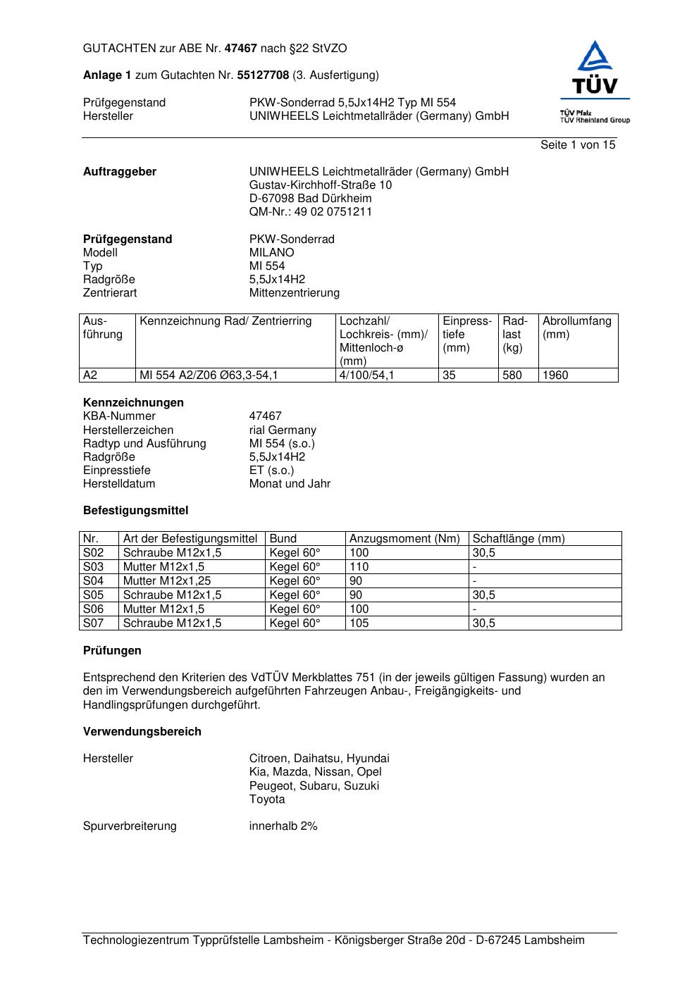 Dieses Gutachten (abe) bezieht sich auf die Alufelge brand-rial MI 554 in der Ausführung 5.5Jx14 ET 0, Mittenloch 0 mm (KBA 47467). Im PDF findest du typischerweise zulässige Reifengrößen, Auflagen/Anbauhinweise und – je nach Dokument – Hinweise zur Eintragung.