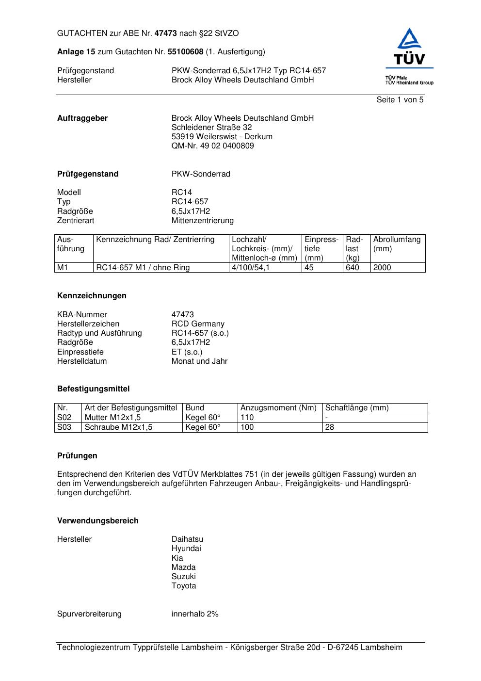 Dieses Gutachten (abe) bezieht sich auf die Alufelge Brock RC14-657 in der Ausführung 6.5Jx17 ET 0, Mittenloch 0 mm (KBA 47473). Im PDF findest du typischerweise zulässige Reifengrößen, Auflagen/Anbauhinweise und – je nach Dokument – Hinweise zur Eintragung.