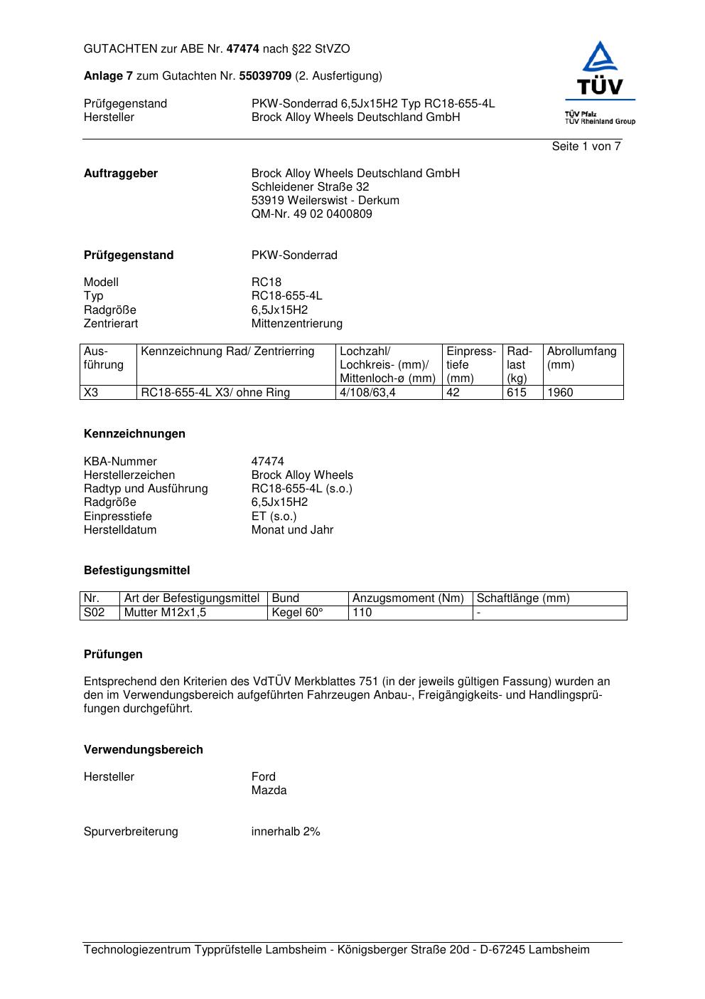 Dieses Gutachten (abe) bezieht sich auf die Alufelge Brock RC18-655 in der Ausführung 6.5Jx15 ET 0, Mittenloch 0 mm (KBA 47474). Im PDF findest du typischerweise zulässige Reifengrößen, Auflagen/Anbauhinweise und – je nach Dokument – Hinweise zur Eintragung.