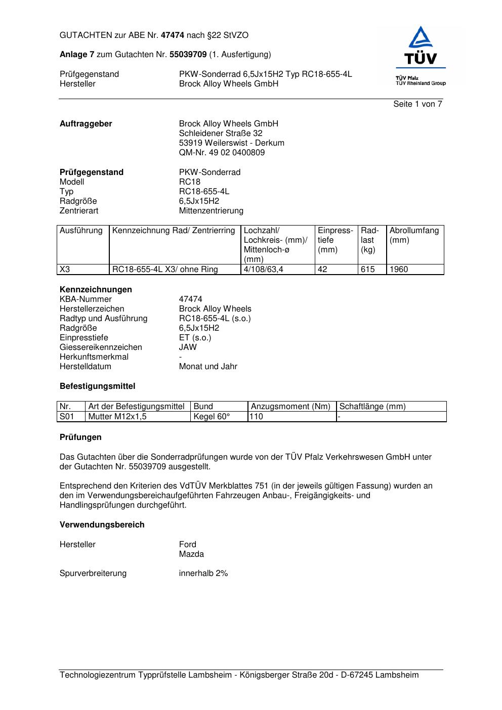 Dieses Gutachten (abe) bezieht sich auf die Alufelge Brock RC18-655 in der Ausführung 6.5Jx15 ET 0, Mittenloch 0 mm (KBA 47474). Im PDF findest du typischerweise zulässige Reifengrößen, Auflagen/Anbauhinweise und – je nach Dokument – Hinweise zur Eintragung.