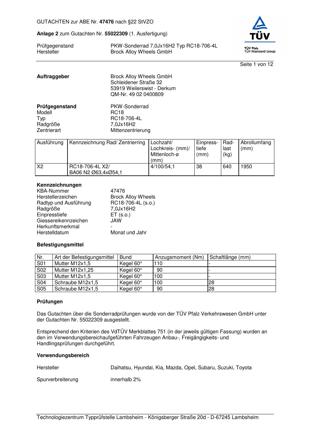 Dieses Gutachten (abe) bezieht sich auf die Alufelge Brock RC18-706 in der Ausführung 7Jx16 ET 0, Mittenloch 0 mm (KBA 47476). Im PDF findest du typischerweise zulässige Reifengrößen, Auflagen/Anbauhinweise und – je nach Dokument – Hinweise zur Eintragung.