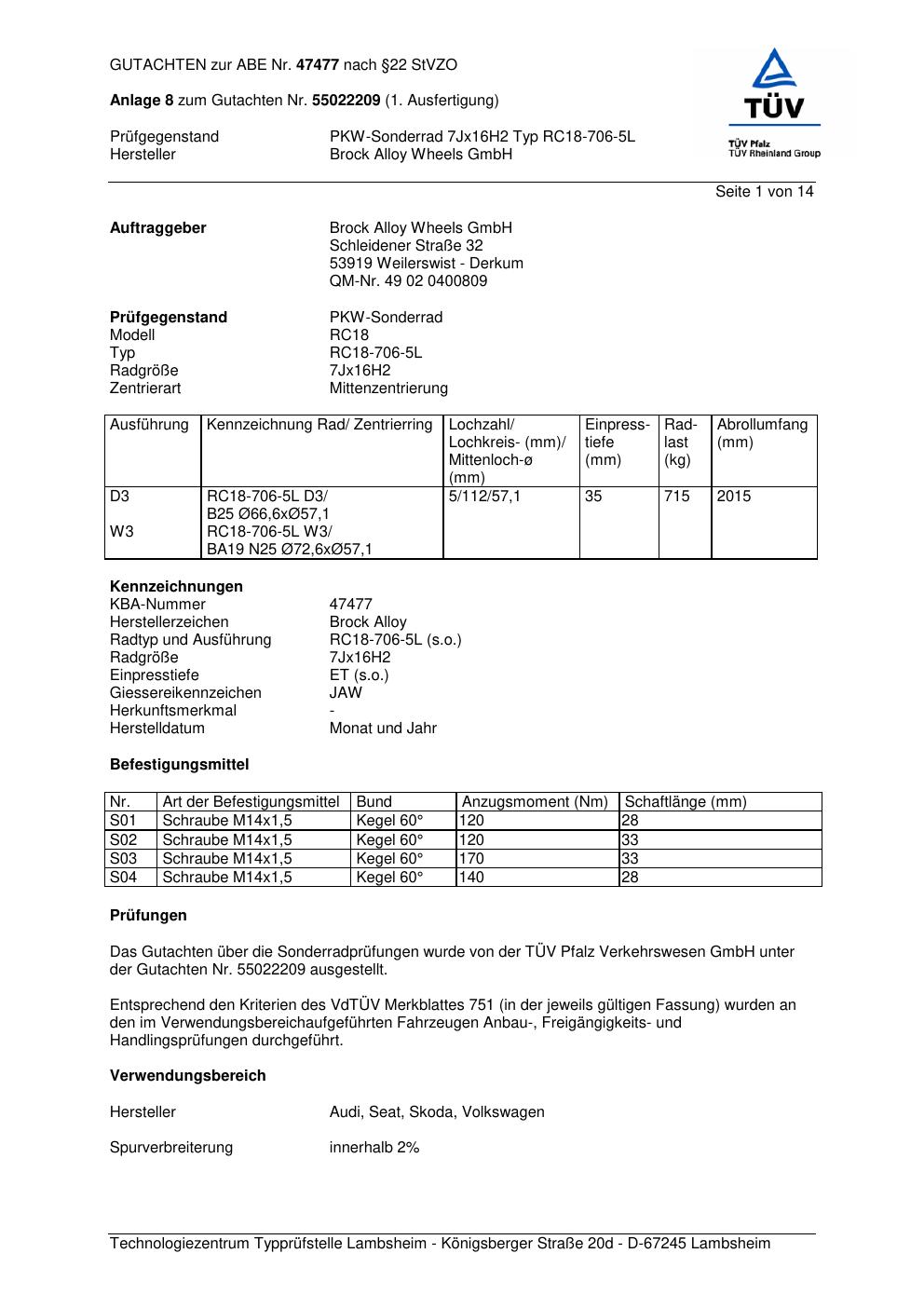 Dieses Gutachten (abe) bezieht sich auf die Alufelge Brock RC18-706 in der Ausführung 7Jx16 ET 0, Mittenloch 0 mm (KBA 47477). Im PDF findest du typischerweise zulässige Reifengrößen, Auflagen/Anbauhinweise und – je nach Dokument – Hinweise zur Eintragung.