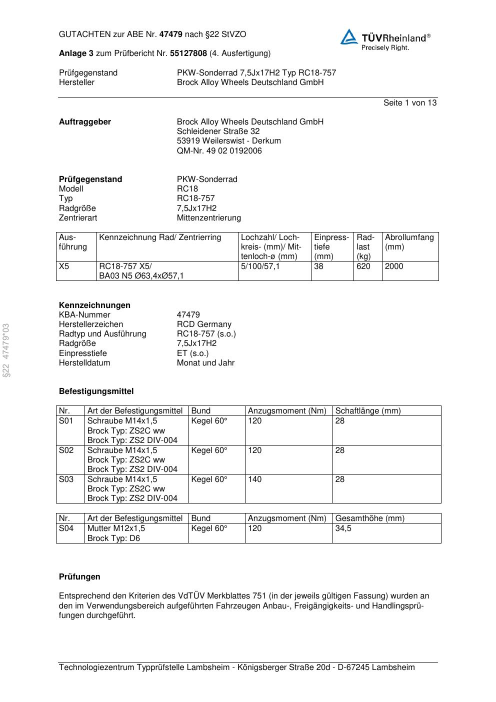Dieses Gutachten (abe) bezieht sich auf die Alufelge Brock RC18-757 in der Ausführung 7.5Jx17 ET 0, Mittenloch 0 mm (KBA 47479). Im PDF findest du typischerweise zulässige Reifengrößen, Auflagen/Anbauhinweise und – je nach Dokument – Hinweise zur Eintragung.