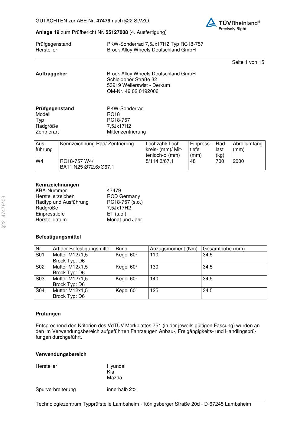 Dieses Gutachten (abe) bezieht sich auf die Alufelge Brock RC18-757 in der Ausführung 7.5Jx17 ET 0, Mittenloch 0 mm (KBA 47479). Im PDF findest du typischerweise zulässige Reifengrößen, Auflagen/Anbauhinweise und – je nach Dokument – Hinweise zur Eintragung.