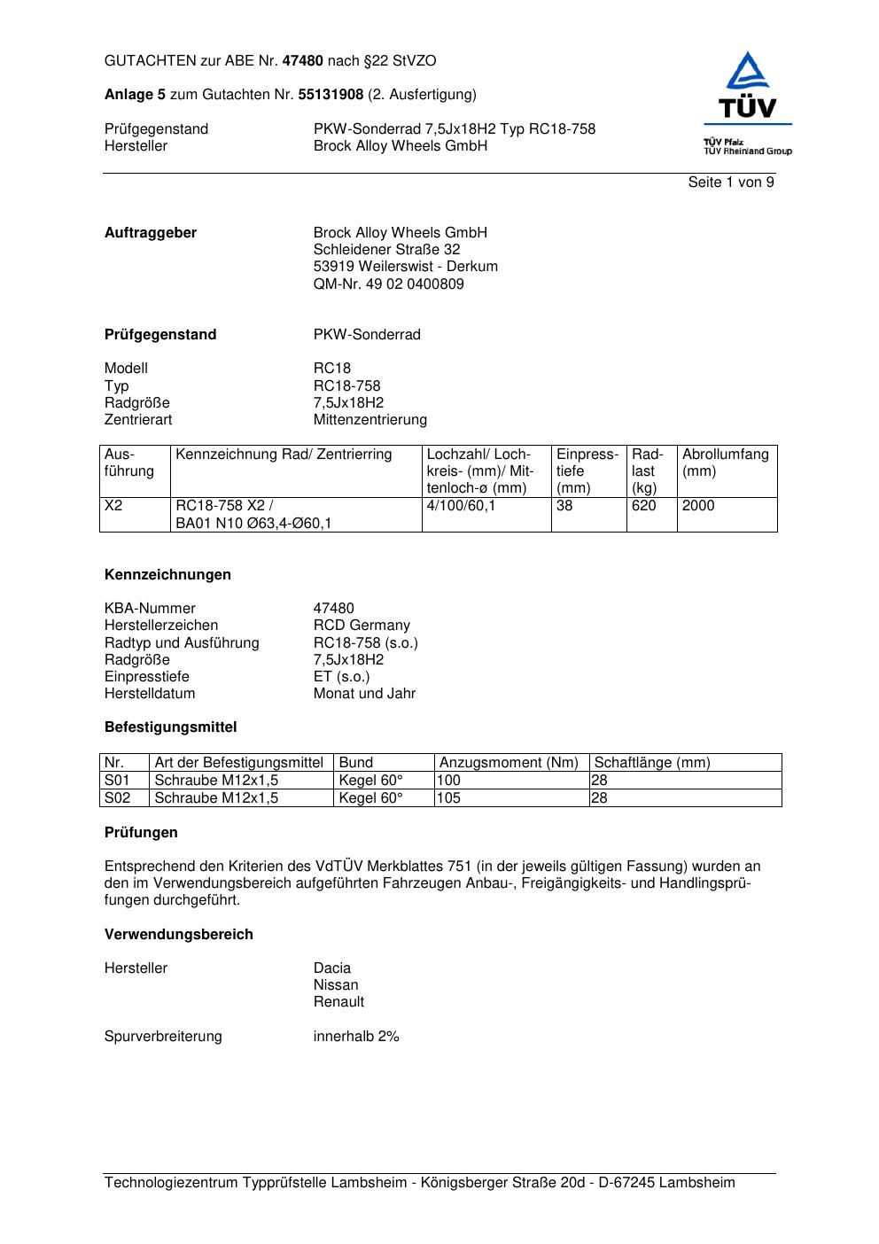 Dieses Gutachten (abe) bezieht sich auf die Alufelge Brock RC18-758 in der Ausführung 7.5Jx18 ET 0, Mittenloch 0 mm (KBA 47480). Im PDF findest du typischerweise zulässige Reifengrößen, Auflagen/Anbauhinweise und – je nach Dokument – Hinweise zur Eintragung.