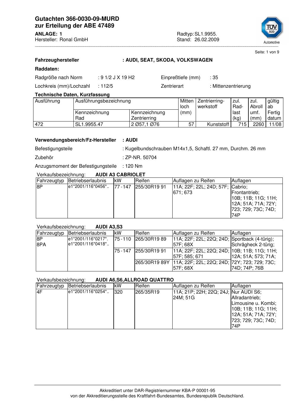 Dieses Gutachten (abe) bezieht sich auf die Alufelge Ronal SL1.9955 in der Ausführung 2Jx19 ET 0, Mittenloch 0 mm (KBA 47489). Im PDF findest du typischerweise zulässige Reifengrößen, Auflagen/Anbauhinweise und – je nach Dokument – Hinweise zur Eintragung.