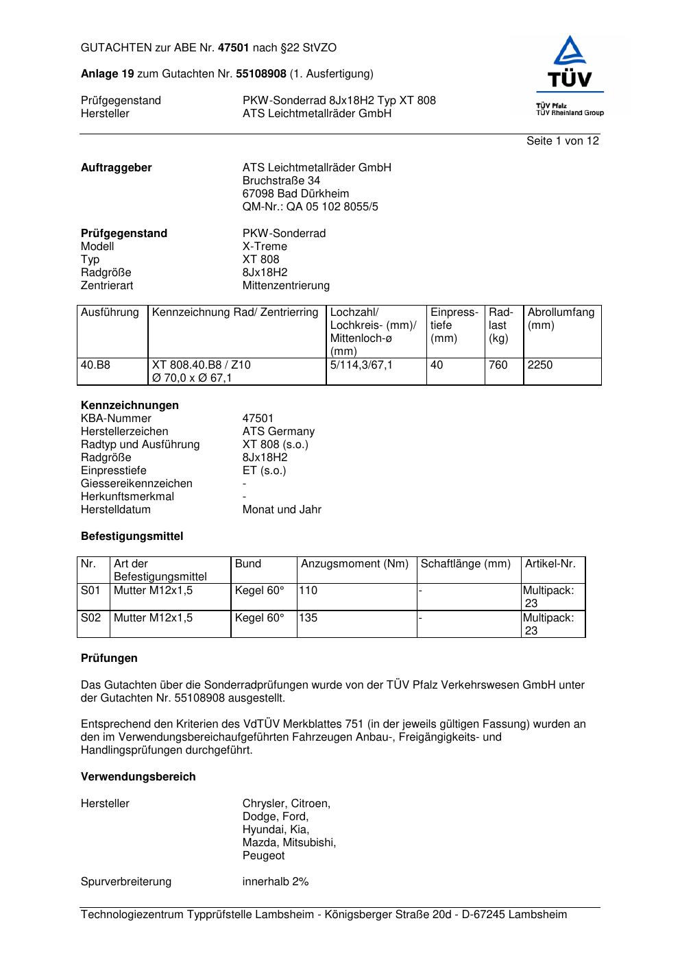Dieses Gutachten (abe) bezieht sich auf die Alufelge ATS XT 808 in der Ausführung 8Jx18 ET 0, Mittenloch 0 mm (KBA 47501). Im PDF findest du typischerweise zulässige Reifengrößen, Auflagen/Anbauhinweise und – je nach Dokument – Hinweise zur Eintragung.