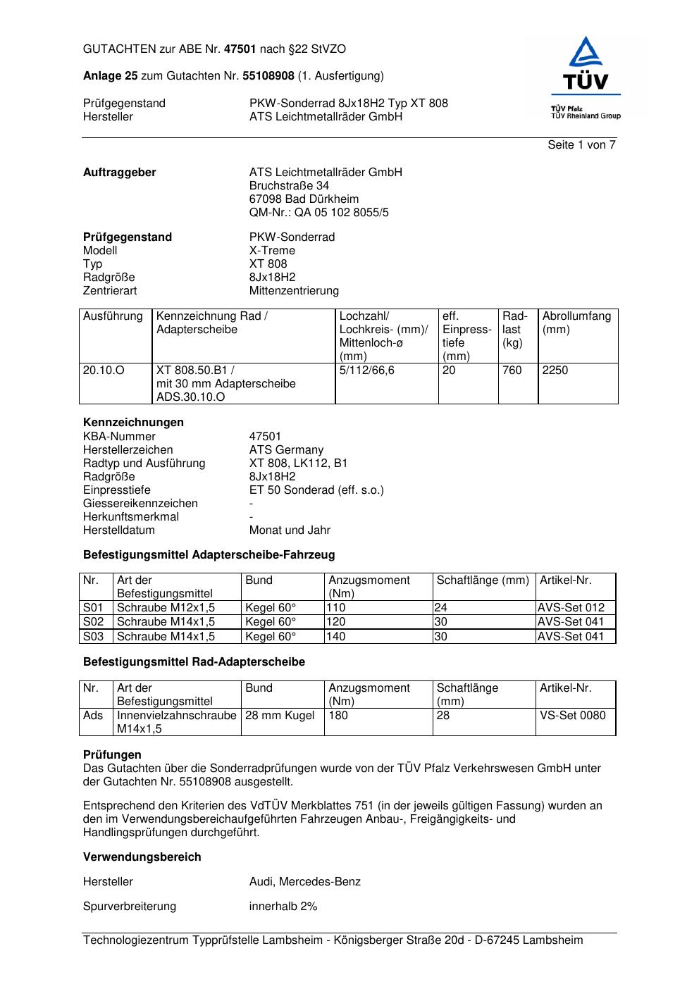 Dieses Gutachten (abe) bezieht sich auf die Alufelge ATS XT 808 in der Ausführung 8Jx18 ET 0, Mittenloch 0 mm (KBA 47501). Im PDF findest du typischerweise zulässige Reifengrößen, Auflagen/Anbauhinweise und – je nach Dokument – Hinweise zur Eintragung.