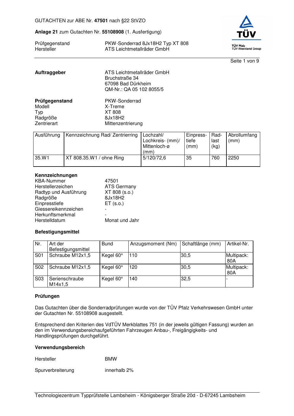 Dieses Gutachten (abe) bezieht sich auf die Alufelge ATS XT 808 in der Ausführung 8Jx18 ET 0, Mittenloch 0 mm (KBA 47501). Im PDF findest du typischerweise zulässige Reifengrößen, Auflagen/Anbauhinweise und – je nach Dokument – Hinweise zur Eintragung.