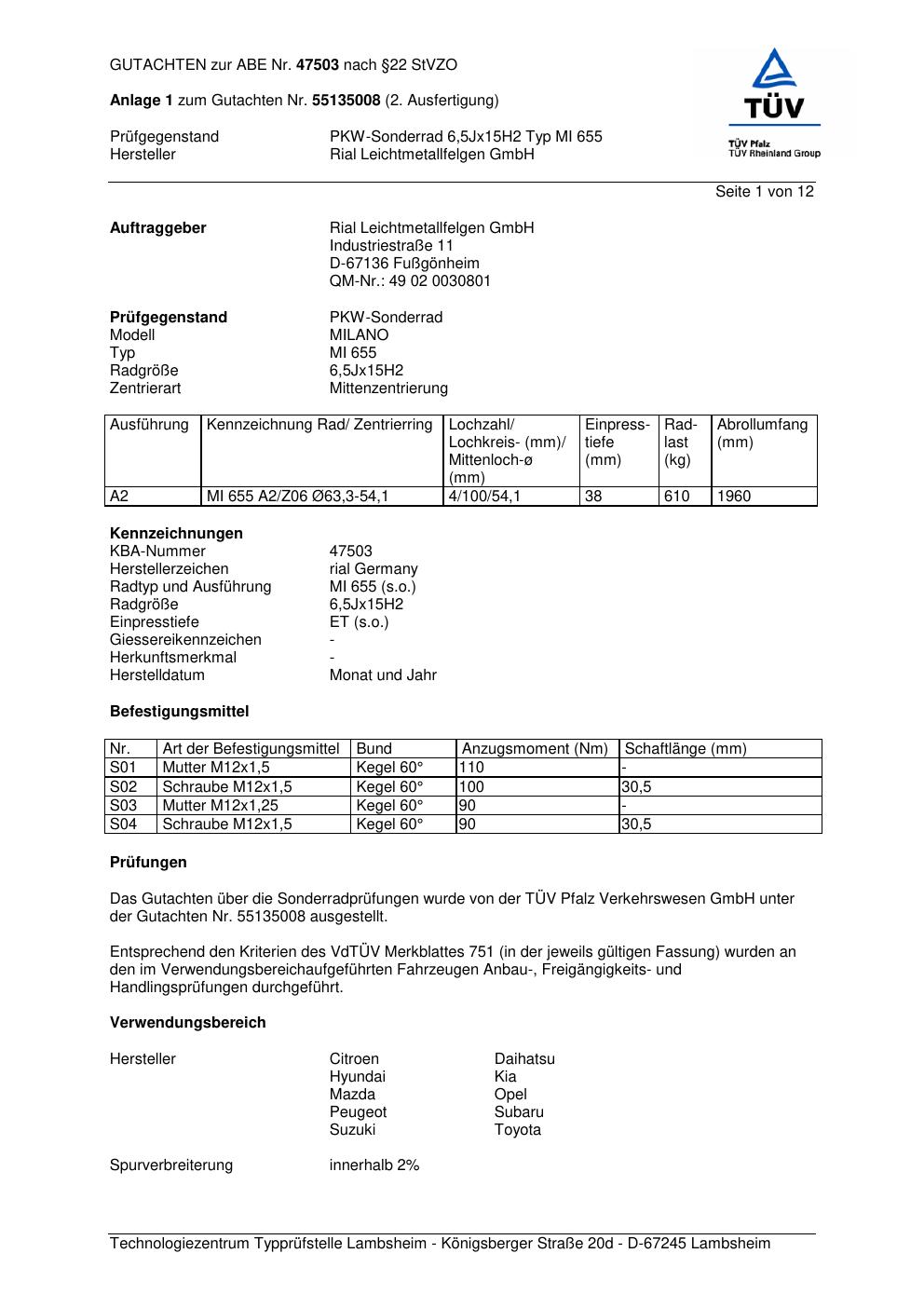Dieses Gutachten (abe) bezieht sich auf die Alufelge brand-rial MI 655 in der Ausführung 6.5Jx15 ET 0, Mittenloch 0 mm (KBA 47503). Im PDF findest du typischerweise zulässige Reifengrößen, Auflagen/Anbauhinweise und – je nach Dokument – Hinweise zur Eintragung.