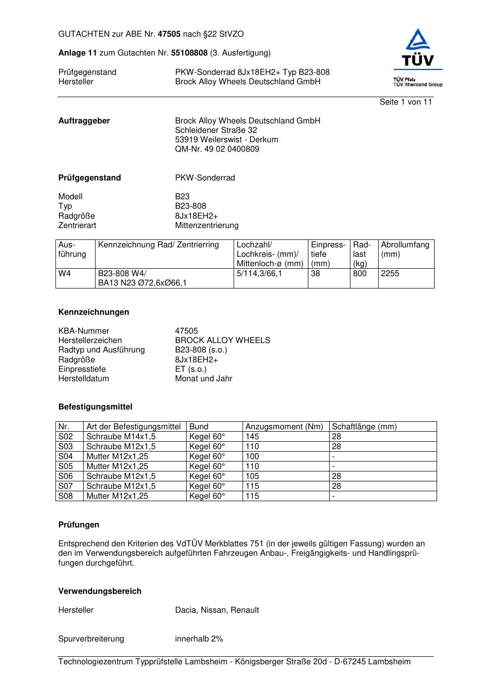 Dieses Gutachten (abe) bezieht sich auf die Alufelge Brock B23-808 in der Ausführung 8Jx18 ET 0, Mittenloch 0 mm (KBA 47505). Im PDF findest du typischerweise zulässige Reifengrößen, Auflagen/Anbauhinweise und – je nach Dokument – Hinweise zur Eintragung.