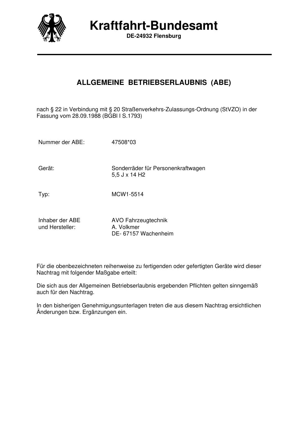 Dieses Gutachten (abe) bezieht sich auf die Alufelge ATS MCW1-5514 in der Ausführung 5.5Jx14 ET 0, Mittenloch 0 mm (KBA 47508). Im PDF findest du typischerweise zulässige Reifengrößen, Auflagen/Anbauhinweise und – je nach Dokument – Hinweise zur Eintragung.