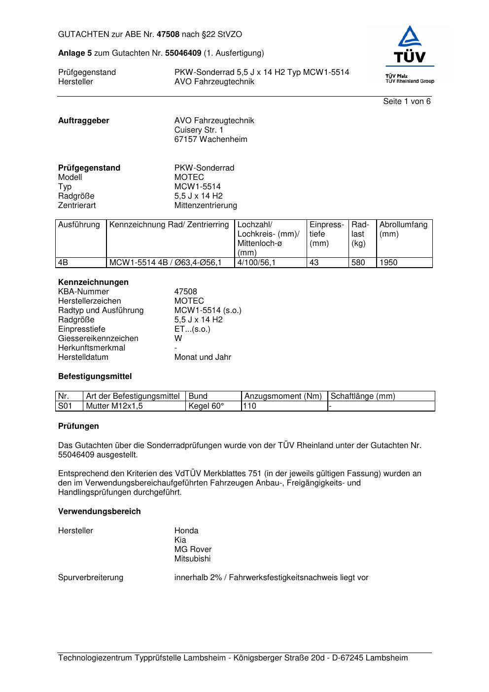 Felgengutachten / abe für Alufelgen co-rod MCW1 -5514 (5.5Jx14 ET 0, Mittenloch 0 mm) mit KBA 47508 (Zertifikatsnummer 47508). Hier kostenlos als PDF herunterladen. Der Download-Link ist 24 Stunden gültig und kann bis zu zwei Mal verwendet werden.
