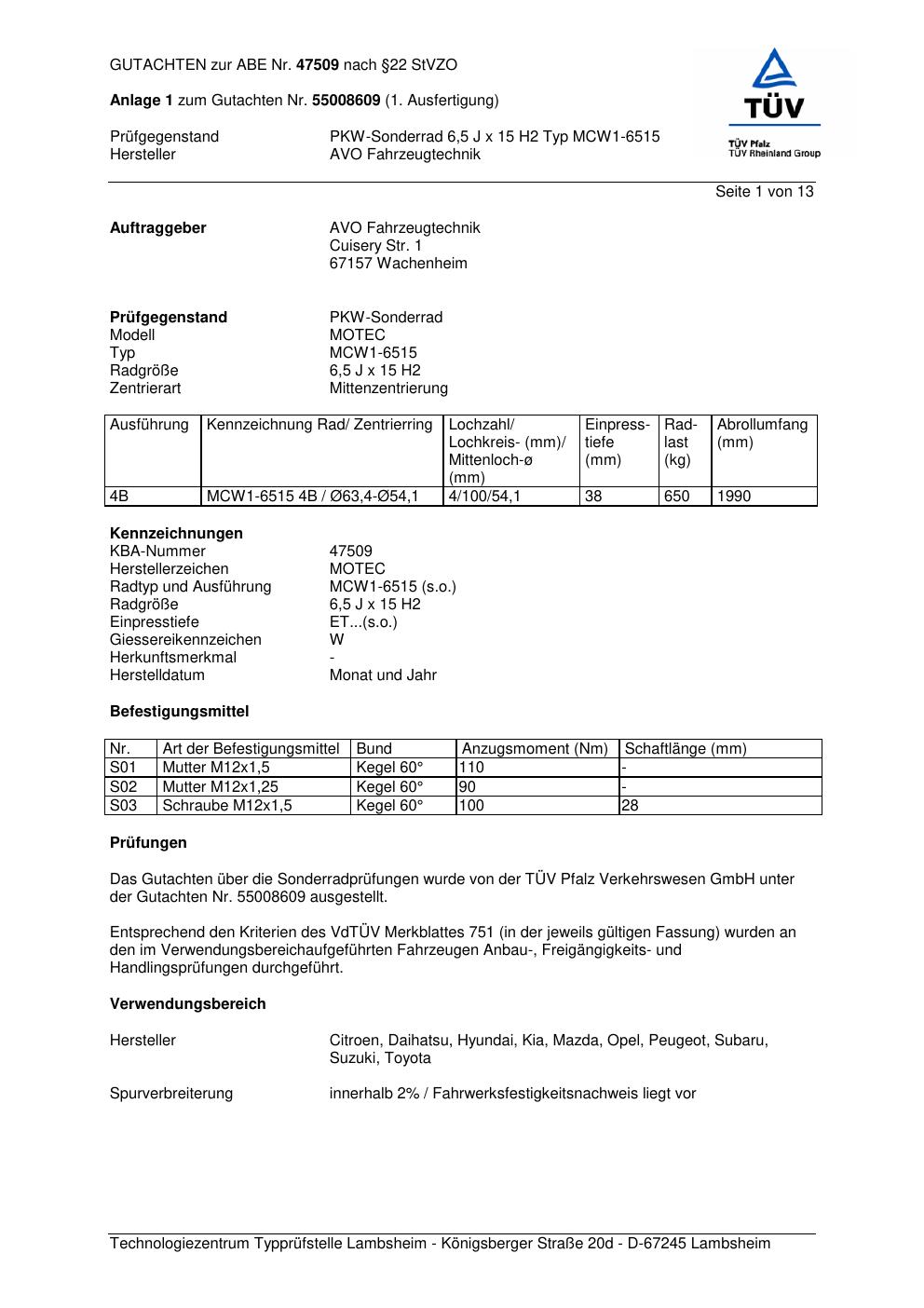 Dieses Gutachten (abe) bezieht sich auf die Alufelge ATS MCW1 -6515 in der Ausführung 6.5Jx15 ET 0, Mittenloch 0 mm (KBA 47509). Im PDF findest du typischerweise zulässige Reifengrößen, Auflagen/Anbauhinweise und – je nach Dokument – Hinweise zur Eintragung.
