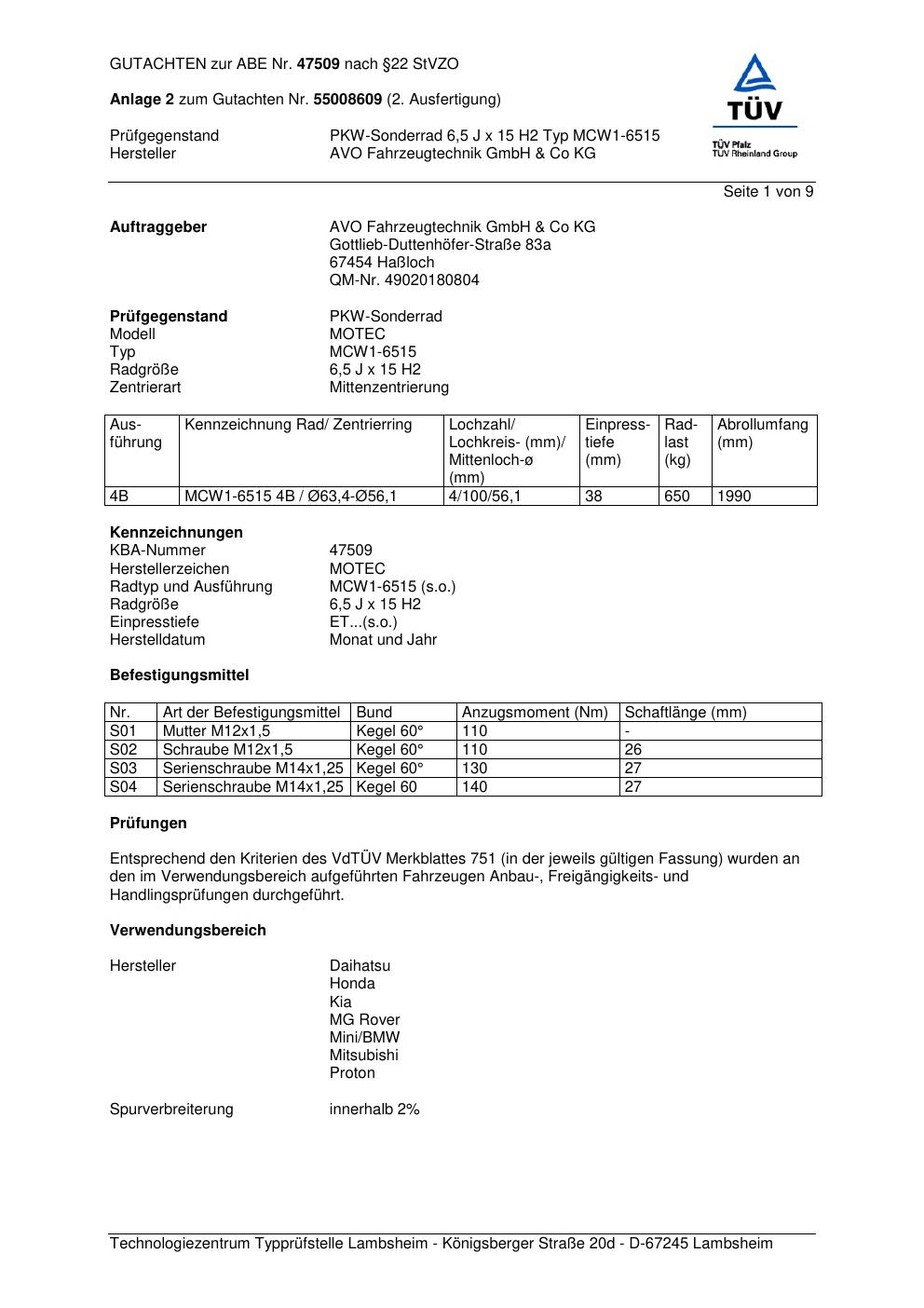 Dieses Gutachten (abe) bezieht sich auf die Alufelge ATS MCW1 -6515 in der Ausführung 6.5Jx15 ET 0, Mittenloch 0 mm (KBA 47509). Im PDF findest du typischerweise zulässige Reifengrößen, Auflagen/Anbauhinweise und – je nach Dokument – Hinweise zur Eintragung.