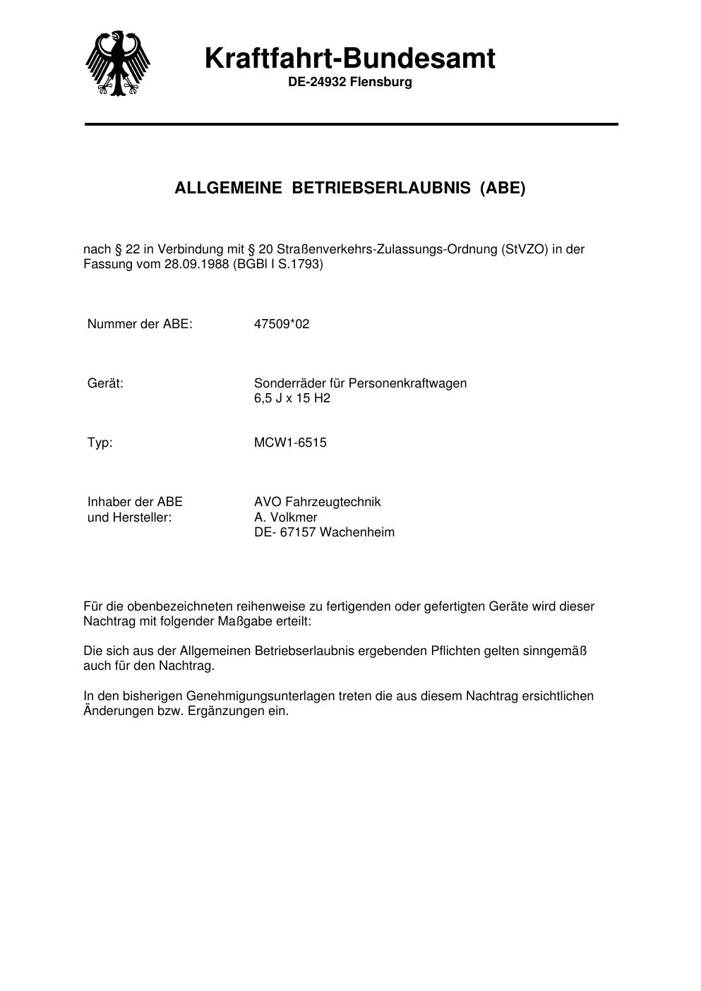 Dieses Gutachten (abe) bezieht sich auf die Alufelge ATS MCW1-6515 in der Ausführung 6.5Jx15 ET 0, Mittenloch 0 mm (KBA 47509). Im PDF findest du typischerweise zulässige Reifengrößen, Auflagen/Anbauhinweise und – je nach Dokument – Hinweise zur Eintragung.
